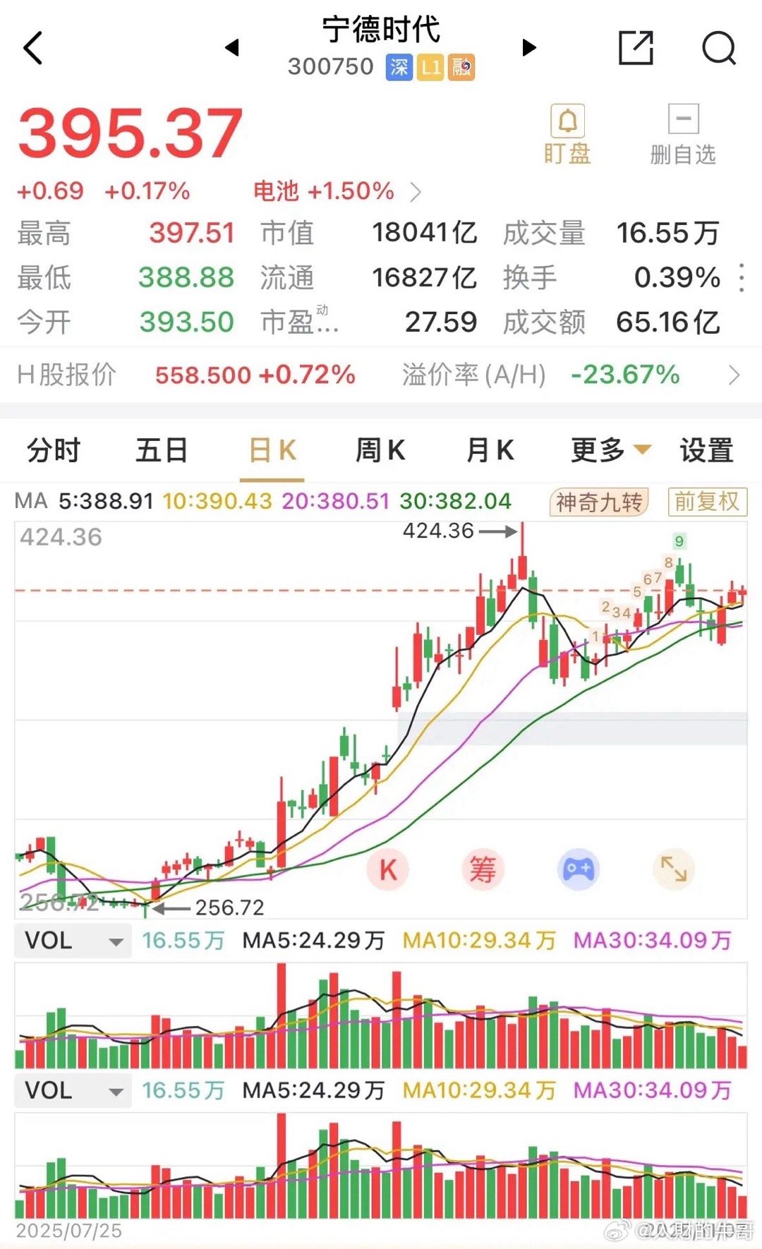 宁王周五的走势明显大有明显落后于电池板块之势,仅小涨0.17%,而板块上涨1.5%。宁王的历史高点在424元,目前为395元,个人预计在400元之下的盘整应该是为了重创新高的强势调整,毕竟以宁王的净利增长水平,目前的27倍动市盈率。估值水平较为温和。