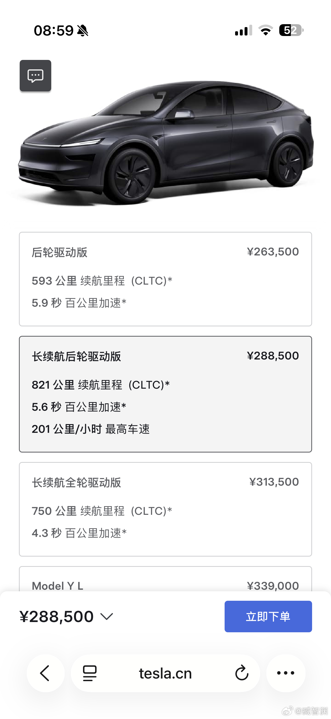 特斯拉Model Y长续航后驱车型上市,28.85W,CLTC 821km。 M