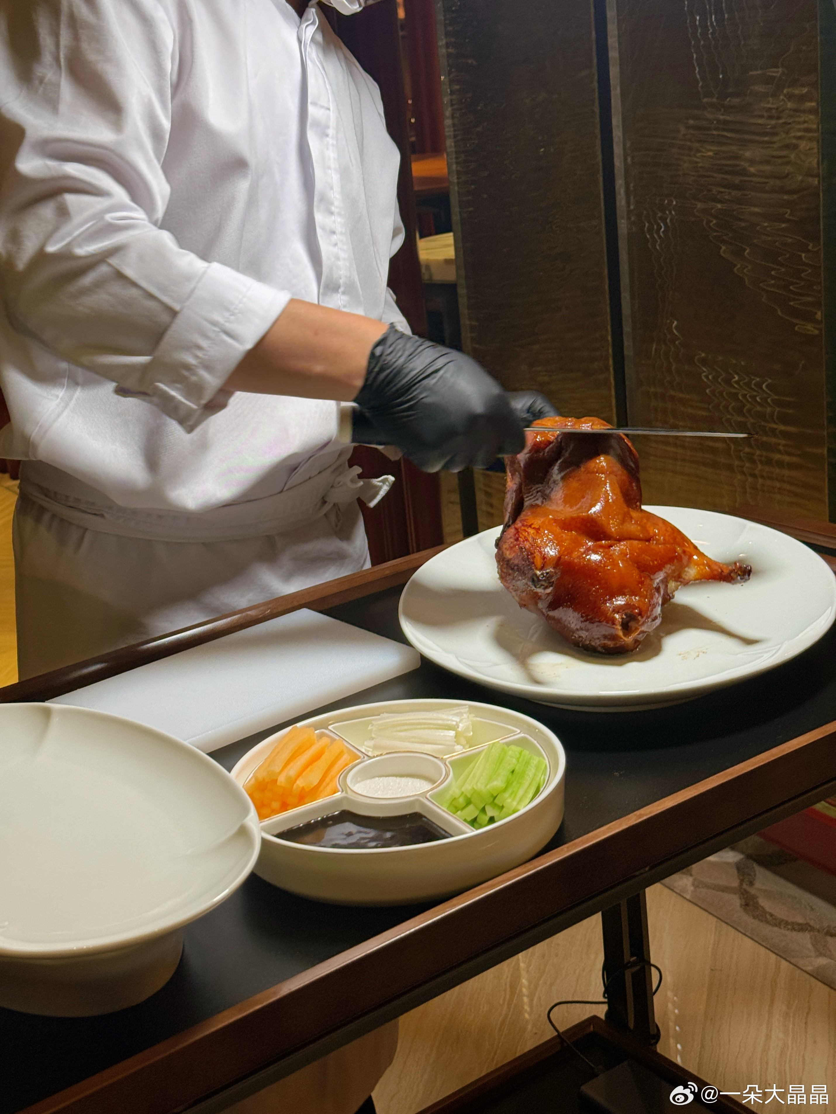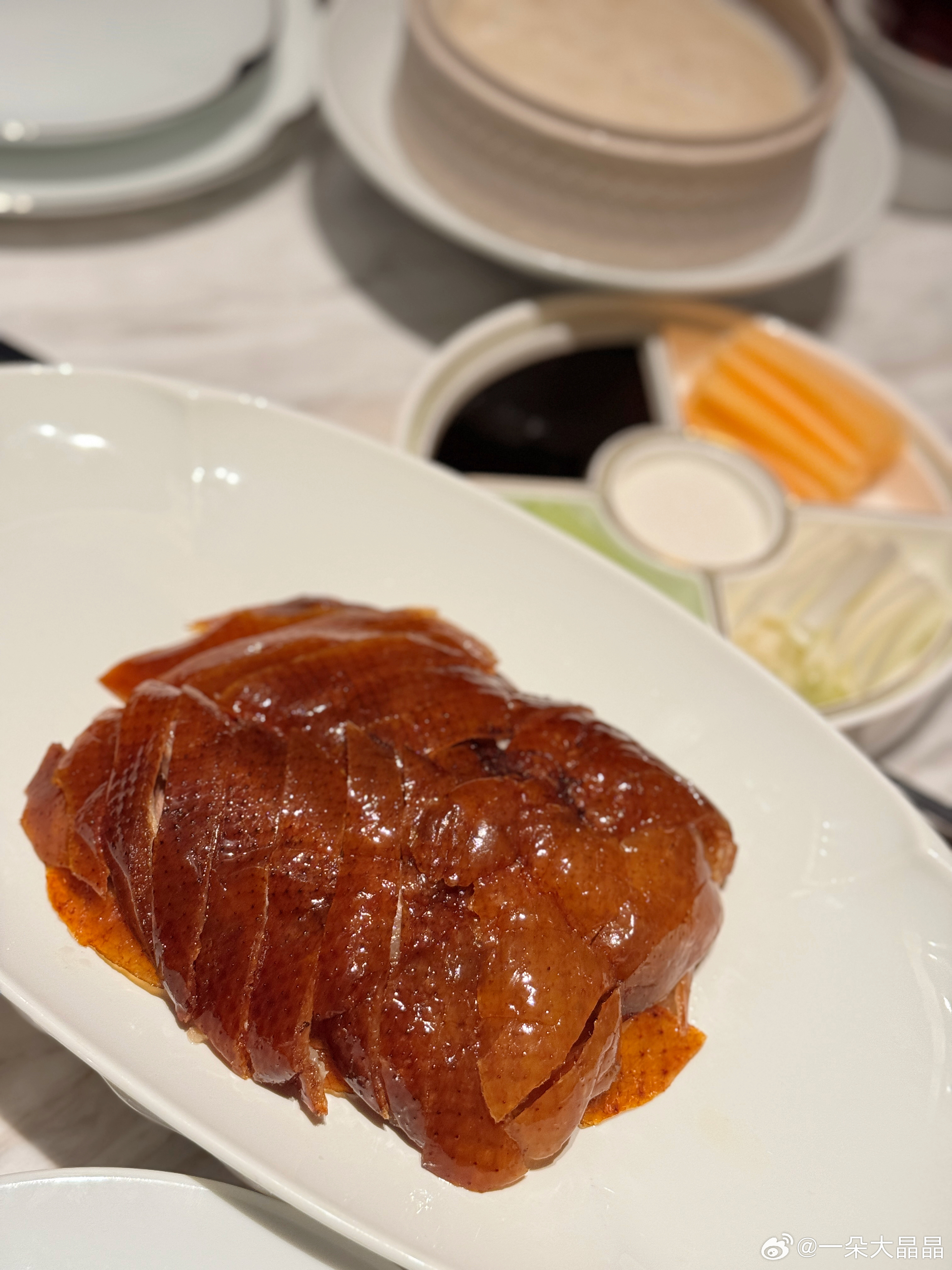 主食选了招牌果木烤鸭,果然没让人失望!鸭皮烤得像金箔一样酥脆,蘸上甜面酱,