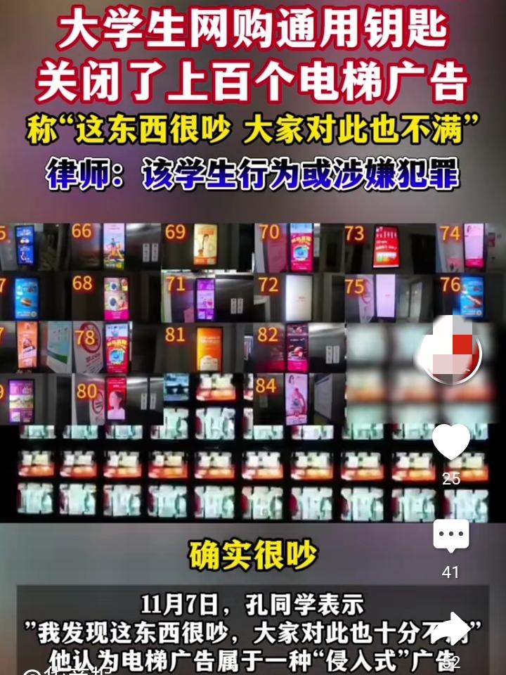 上海嘉定一名大学生嫌弃电梯广告的喧嚣声,于是通过网络购买万通钥匙,查询如何关闭广告程序,如此在一个漆黑的夜晚他悄然行动。 该名大学生喜欢安静,可在坐电梯的时候广告声震耳欲聋,一度让他在区区几十秒内抓耳挠腮愤怒不已。 终于有一天他开始通过网络查询如何关闭电梯广告程序,对于高智商人群,总是会特别在意内心的声音,对于别人的成果通常情况下置若罔闻,而柔弱的人反之会特别照顾别人的情绪,这可能是强弱之间的区别。 在一个不太漆黑的夜晚他悄然行动,走进电梯后鬼鬼祟祟的,双手颤抖的把钥匙插进孔里,原本一个很平常的动作,在今天却异常难以完成,或许是他内心出现了莫名的担忧,就这样在非常紧张的情况下他打开了控制门,按照网上学的教程,双手同时按住按钮即可选择关闭广告程序,第一次顺利得逞后在以后的休息日多次效仿,大约关闭了上百个电梯内的广告,他的解释是:这是一种入侵式广告,我这样做是替大家发声,他们也应该非常排斥电梯广告声音,公司法务表示:这种行为已经形成寻滋扰事,会商议后提出法律诉讼。 对于电梯广告声音这个应该效仿公交车广告模式,关闭声效或许更易让人们接受,所谓有心人无声胜有声,毕竟让消费者心动才会选择购买,过于宣传未必有好的效果。 心理模式极易复杂,意愿无法形容它的沟壑,广告广而告之即可,每个人在看广告的第一眼内心就已经有了答案,所以后面的内容和声音关系不大,如果感兴趣会极致追捧,无聊了就是八匹马你也追不上它,就像年轻人谈恋爱,女追男隔层纱,男追女隔座山,其实并非事情出现蹊跷,而是人内心的需求在这一刻具象化了,就像所做的产品一样,采取女追男隔层纱的理念更容易开拓市场,所覆盖的不是需求而是诱惑,就算是被骗那也是心甘情愿,所以以一个锐度的切入点会让事情变得容易,所谓磨刀不误砍柴工,大规模的投放就润物细无声,小规模的试水就平地一声雷,这不是矫情而是广告模式的一种理念。