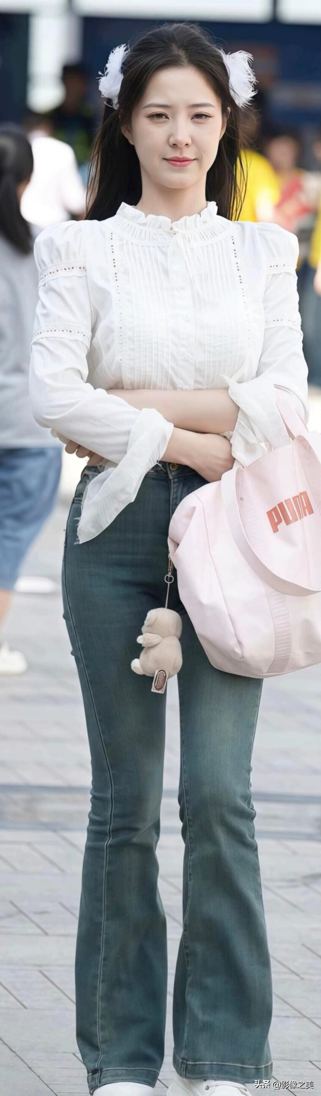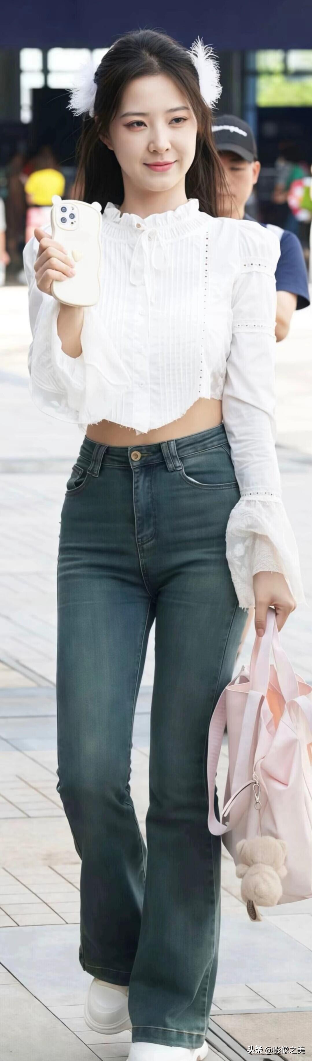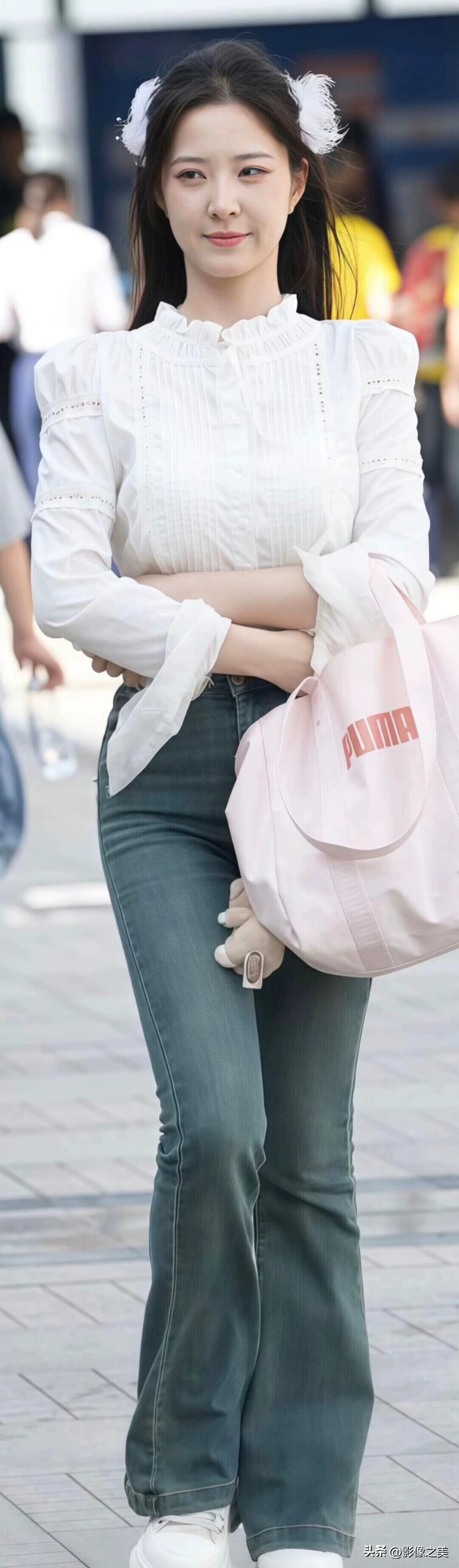 白色花边领衬衫配微喇牛仔裤,头发上的小发饰很可爱,粉色包包和小白鞋,看起来清爽又舒服。
