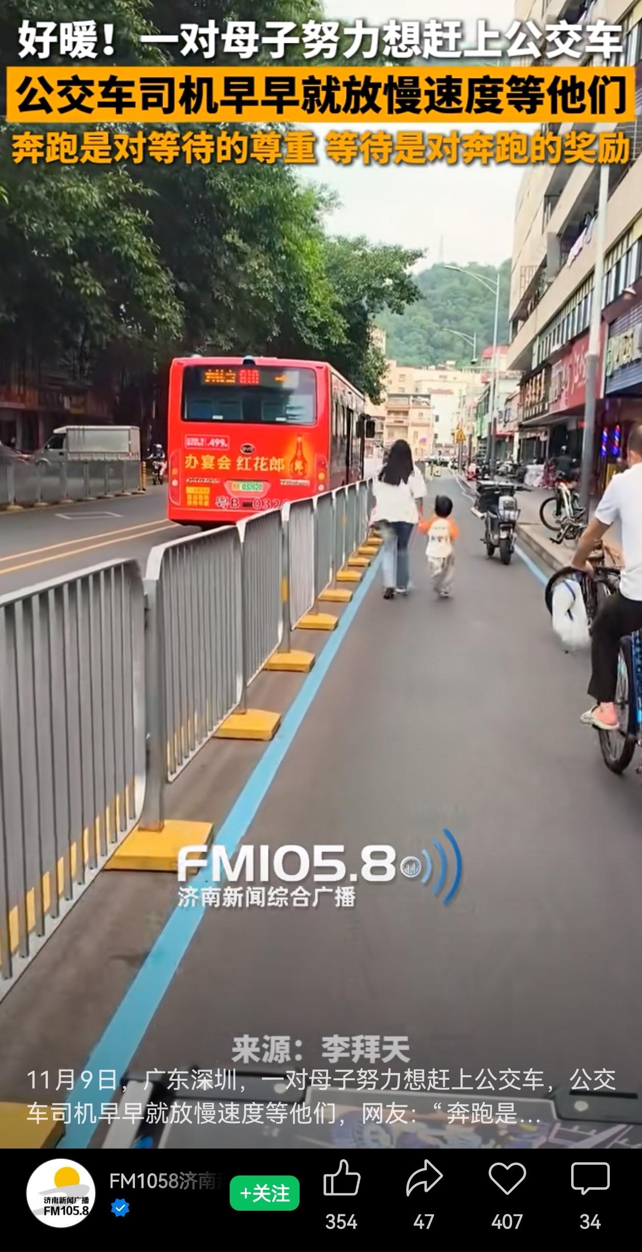 又被暖到!广东深圳,11月9日。一对母子快到站台时,一辆公交车在他们身边开过。年轻的妈妈看到公交车擦身而过,拉着自己的儿子拼命跑着追公交。 妈妈拉着儿子跑不快,但是看得到,已经尽力了!温暖的瞬间出现了:原来公交车司机师傅老远就从后视镜看见了奔跑的两母子,已经悄悄地放慢车速,慢慢开车,等着…… “溜达”的公交车在母子俩气喘吁吁尽力赶上的最后一刻,正好停靠,隔着屏幕都替俩母子高兴啊!终于赶上了! “奔跑是对等待者的尊重,等待是对奔跑者的奖励。”可不就是这样嘛!你珍惜别人的时间努力奔跑,别人也用善意回应你的努力。 这种你为我慢一点,我为你快一步的默契,让冷冰冰的公交车厢一下子有了温度。 又一次看到这样的视频,身边这样有爱的小事儿越来越多了!司机手握着方向盘,眼里看着赶路人,那一脚温柔的等待,比啥宣传语都动人。 司机师傅方向盘上的温度,不就是一个城市最真实的温度吗?为这样的深圳点赞! 信息来源:FM1058济南新闻广播
