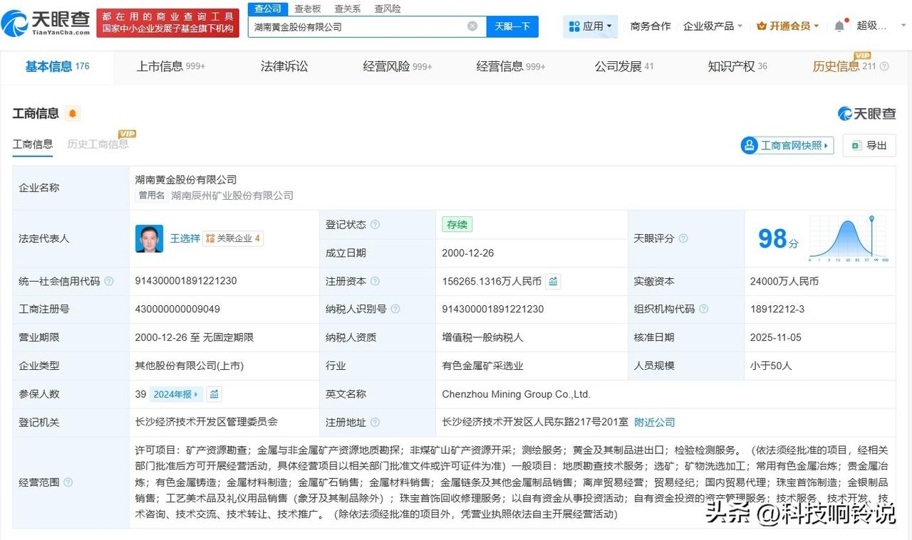 【湖南黄金增资至15.63亿 增幅30%】 天眼查App显示,近日,湖南黄金(002155)发生工商变更,注册资本由约12.02亿人民币增至约15.63亿人民币,增幅30%。 湖南黄金股份有限公司成立于2000年12月,法定代表人为王选祥,经营范围包括矿产资源勘查、金属与非金属矿产资源地质勘探、非煤矿山矿产资源开采、测绘服务等。股东信息显示,该公司由湖南黄金集团有限责任公司、香港中央结算有限公司等共同持股。 天眼查信息: