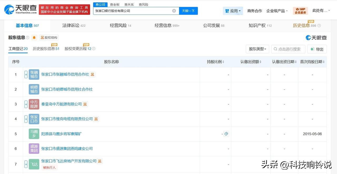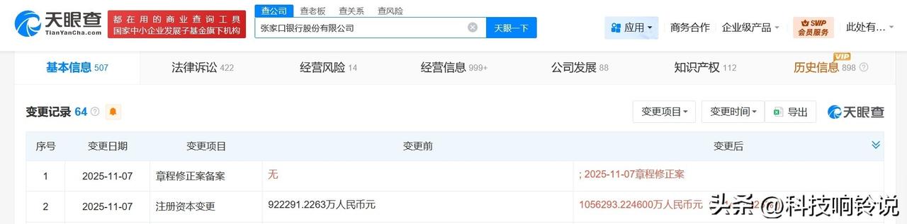 【张家口银行增资至约105.6亿 增幅约14.5%】 天眼查工商信息显示,近日,张家口银行股份有限公司发生工商变更,注册资本由约92.2亿人民币增至约105.6亿人民币,增幅约14.5%。 该公司成立于2001年10月,法定代表人为高毅峰,经营范围含人民币业务,吸收公众存款,发放短期、中期和长期贷款,办理国内结算,办理票据承兑与贴现,发行金融债券,代理发行、代理兑付、承销政府债券等。股东信息显示,该公司由张家口市张融城市信用合作社、张家口市明德城市信用社合作社、秦皇岛中方能源有限公司等共同持股。 天眼查信息:
