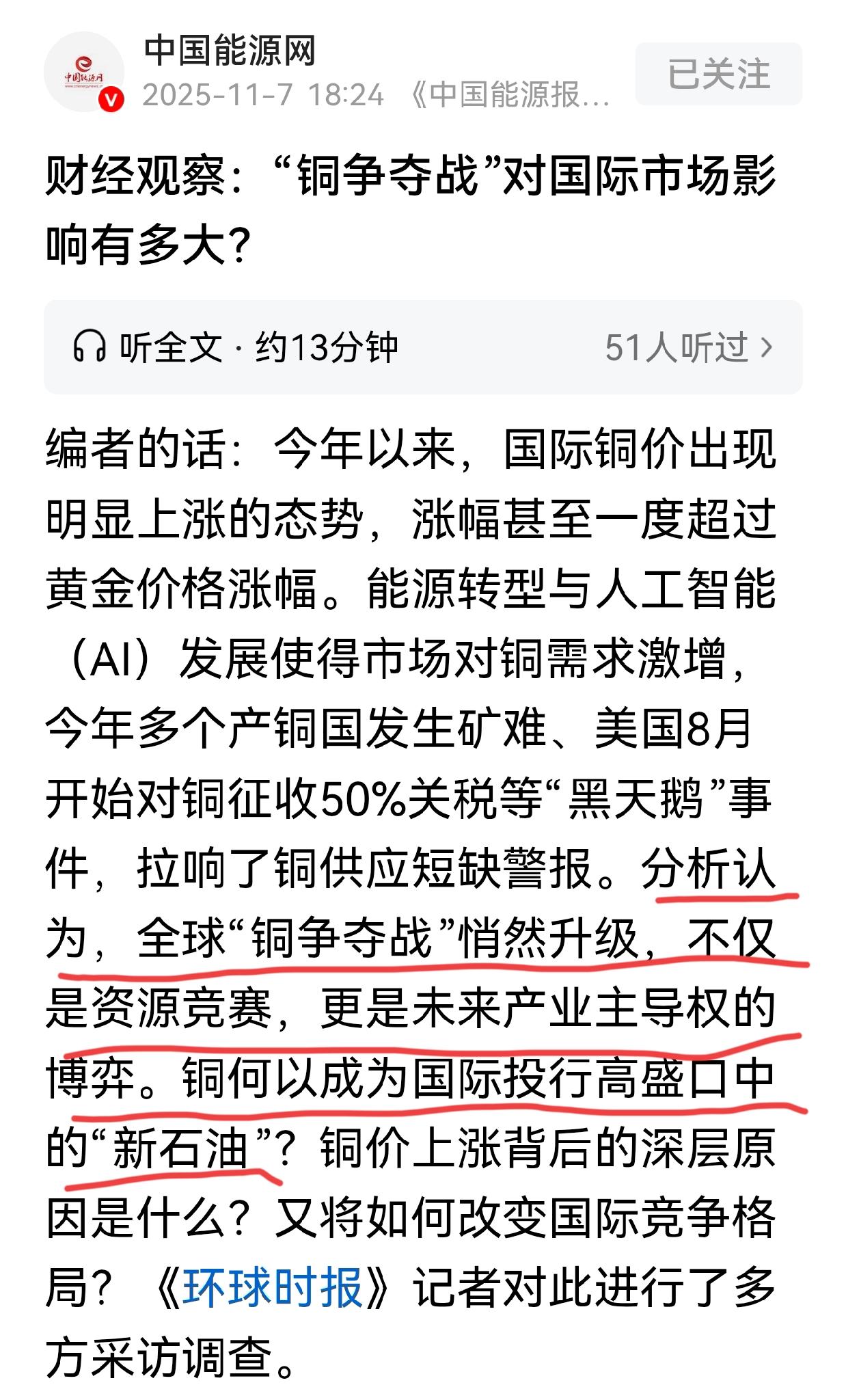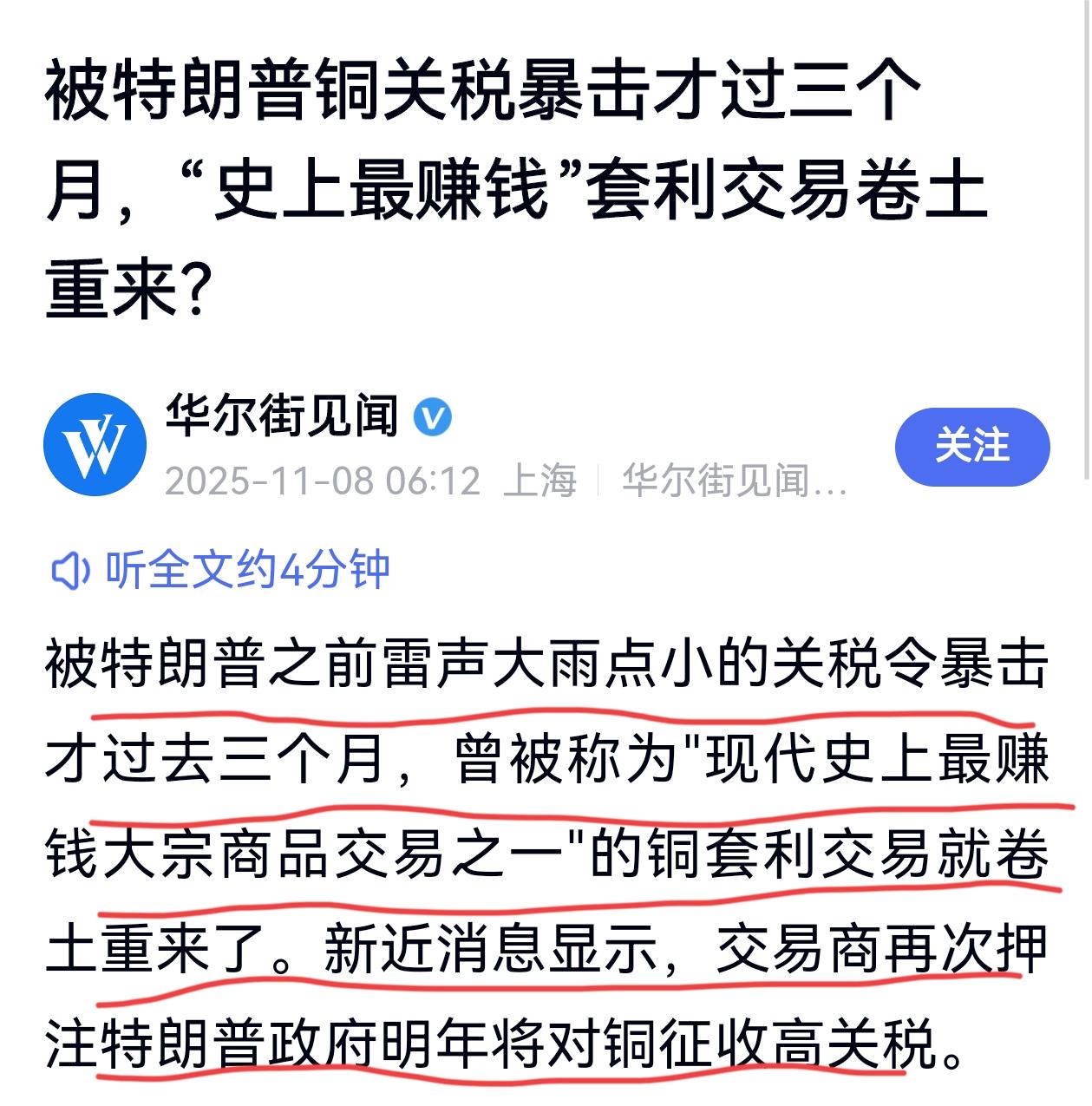美国交易商又开始囤铜了!近几周美国的维多、托克等多家贸易巨头与智利生产商接洽,以求锁定2026年向美国供应铜的年度协议,支付价格高出伦铜基准价格500美元以上,出价约是中国制造商现货采购价的10倍。 无利不起早,美国交易商为什么高价圈铜,还是想押注铜关税再赚上一笔,反映了投资者对懂王明年重起商品级铜关税的预期。实际上铜关税前景并没消失,美商务部建议推迟征收,从2027年征收15%的关税,到2028年征收30%。一旦铜关税成真,那交易商又会像今年上半年一样赚得盆满钵满。 老美加铜关税,核心还是要铜产业回归其本土,产业得以重建。毕竟铜太重要了,高盛讲铜是“新石油”,石油一度是经济命脉,老美掌控石油市场,保证了几十年的发展,现在无铜则无脱碳,新能源和人工智能基础设施离不开铜,这种战略资源老美是不会放弃争夺的,加税就会导致大量铜流入美国。交易商就是看准了这一点,才敢高价囤铜。 本来铜就供应短缺,美交易商再度囤积铜,一定会再度搅动铜供应市场,铜流向美国,其他市场也会涨价,具备铜矿资源的铜业公司值得关注。