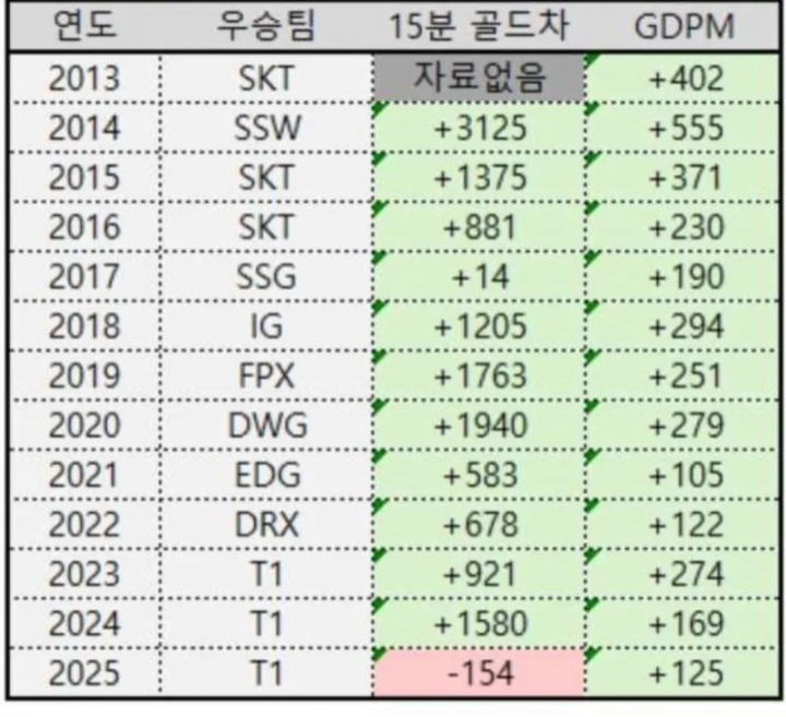 直播吧11月10日讯昨日S15全球总决赛上,T1击败KT夺得冠军,赛后韩网整理历年S赛冠军的前15分经济差,其中今年T1是唯一一支负15分经济差夺冠的队伍!