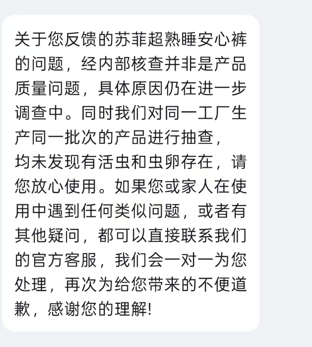 11月10日,记者尝试联系视频发布者未果,同日苏菲官方客服就此事回应:“经内部核查并非是产品质量问题,具体原因仍在进一步调查中。同时我们对同一工厂生产同一批次的产品进行抽查,均未发现有活虫和虫卵存在,请您放心使用。”