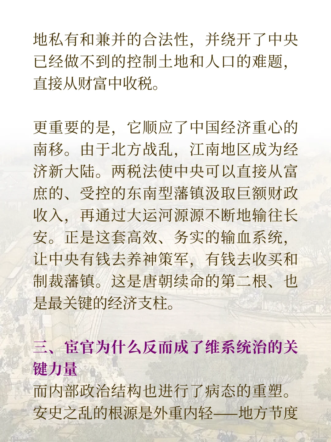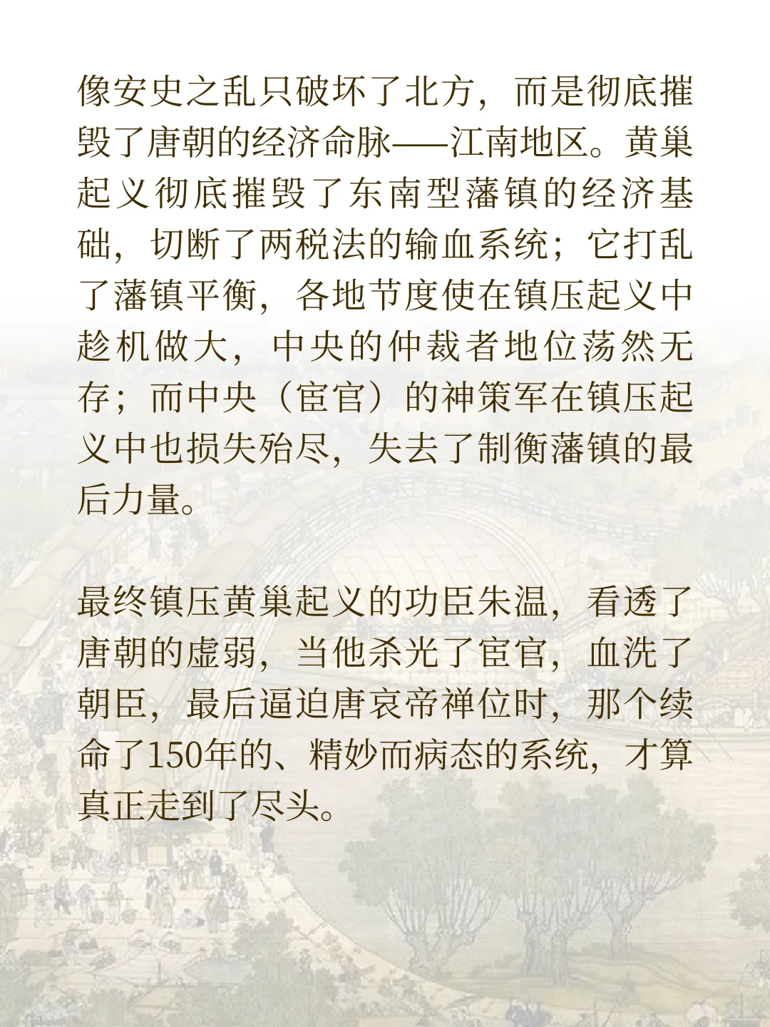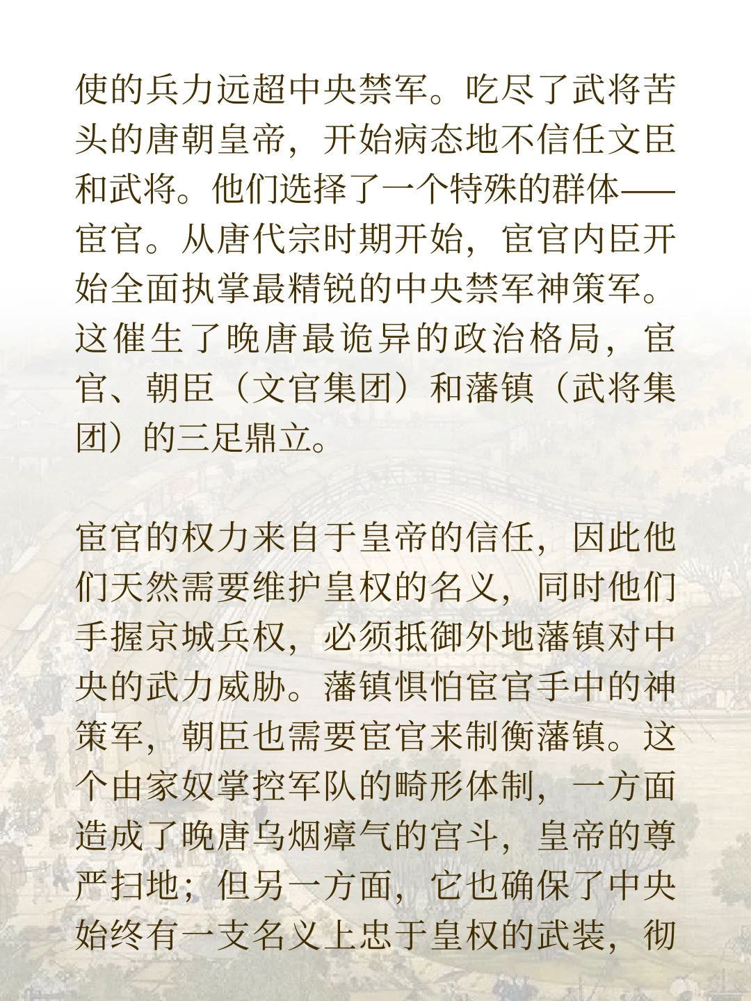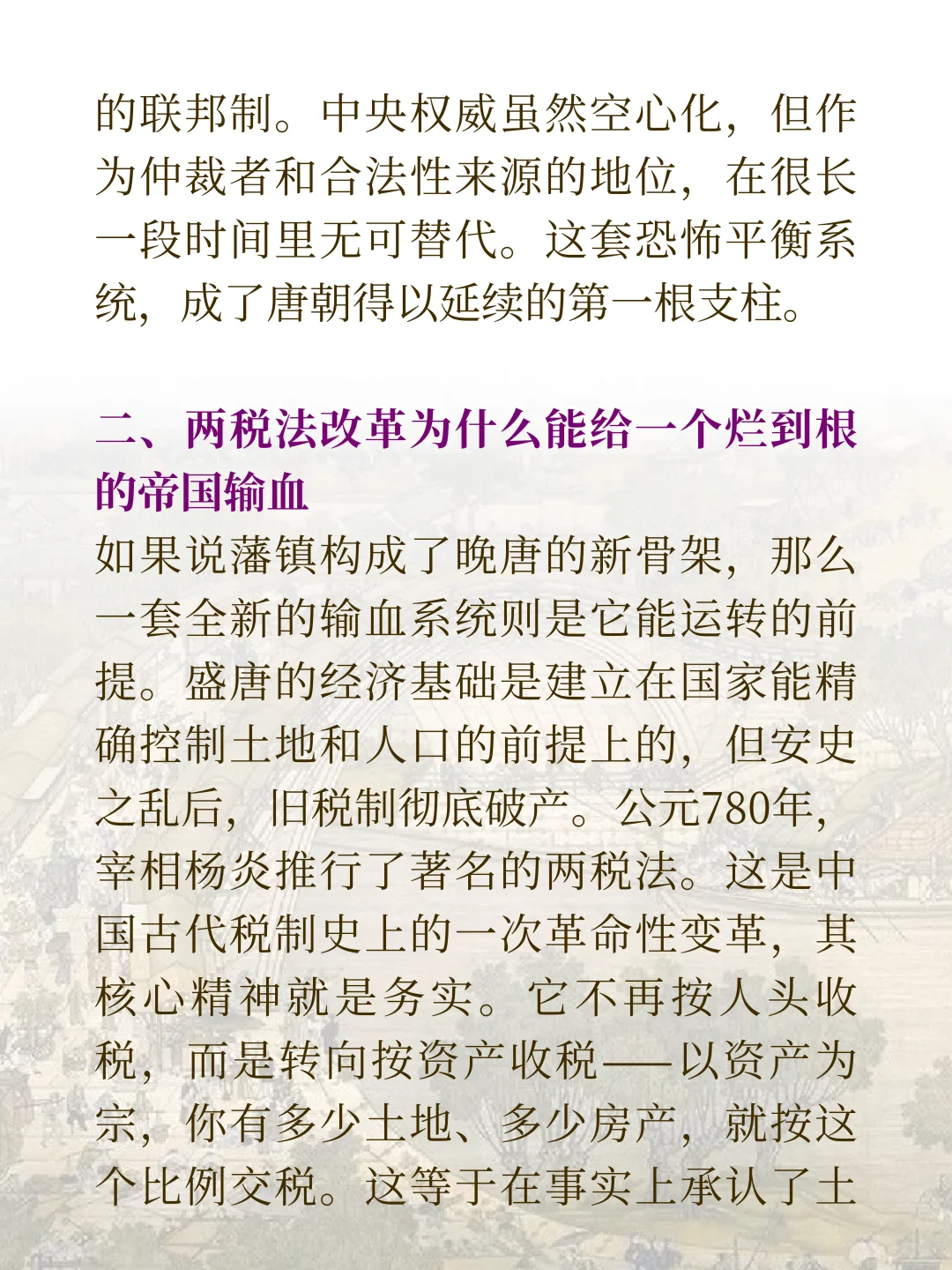 这篇文章,我们就要来聊聊这个破碎的王朝。我们会看到它怎么靠三根柱子撑下来的。它有三根支柱,第一根是藩镇之间的奇怪平衡。第二根是新的收钱方法,两税法。第三根是宦官掌握了军队。这是一个特别病态又特别精妙的系统。我们了解了它,才能真正看懂晚唐。