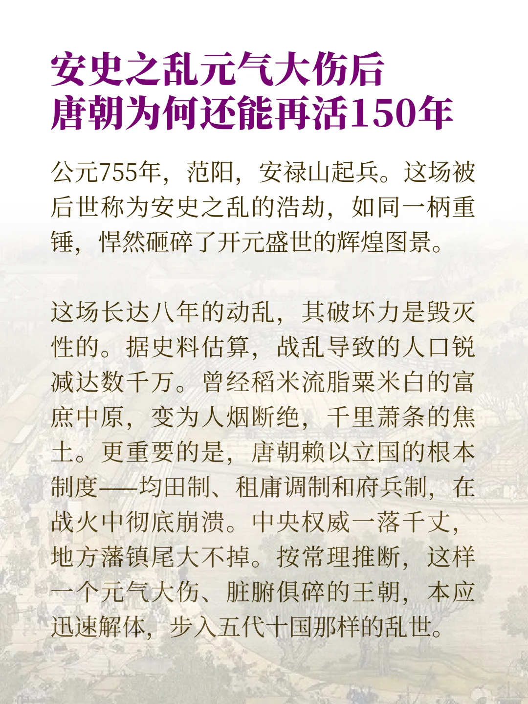 我们提到唐朝,很多人第一反应就是盛唐。那是一个万国来朝的黄金时代。但公元755年的安史之乱,几乎把一切都毁了。教科书告诉我们,这是唐朝由盛转衰的转折点。很多人以为,唐朝在那之后就快不行了。一个奇怪的事实出现了,这个王朝在元气大伤后,竟然又撑了150年才灭亡。这个时间甚至比盛唐的时间还要长。