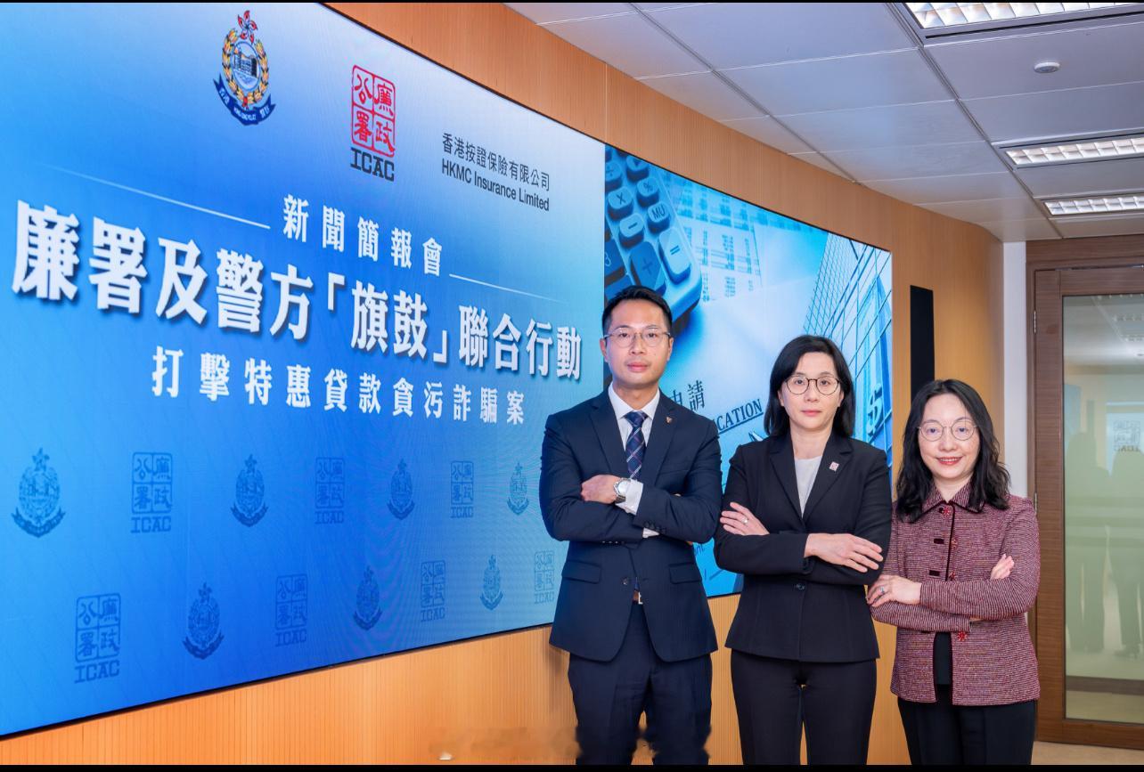圖4:香港廉署執行處首席調查主任余顯麗(中)、警方商業罪案調查科訛騙案調查組總督察何潤賢(左)及按證保險公司中小企融資擔保計劃業務運作副總裁莫愛蘭(右)向傳媒簡報「旗鼓」聯合行動的詳情。