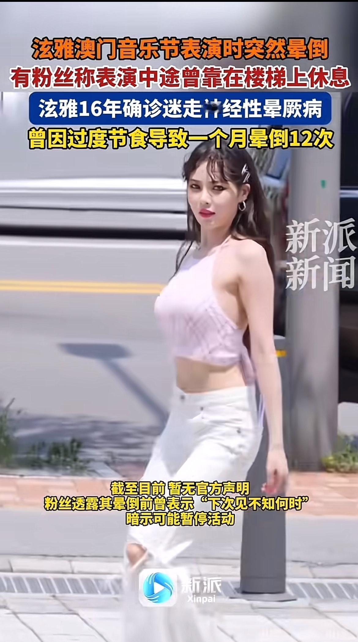 11月9日,泫雅在澳门 Water Bomb 音乐节表演《Bubble Pop》后晕倒在舞台,被工作人员抱离。 泫雅这不是第一次晕倒了,她曾透露因饮食不规律和精神压力大,一个月晕倒12次,还曾一周不吃东西导致神经性晕倒。早在2019年,她就公开自己患有恐慌障碍和忧郁症。 当晚泫雅在社交平台致歉并报平安,说自己也不记得什么。泫雅1992年出生,有《Change》《Bubble Pop》等代表作。真心希望她能多注意身体,别再被健康问题困扰了。