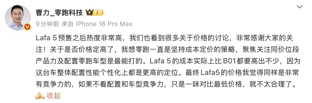 就像曹总说的,15万以内没有比Lafa 5产品配置更强的车型了,目前预售10.58W起步,我觉得诚意OK,期待下上市正式价格。