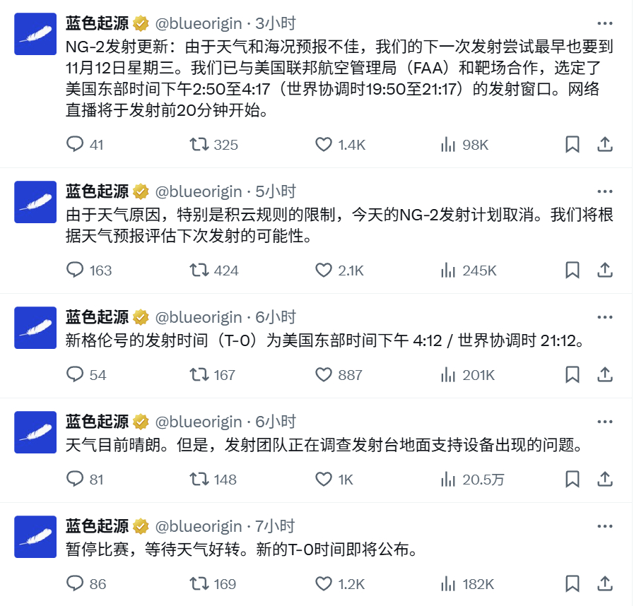 【蓝色起源新格伦火箭因天气推迟第二次发射】当地时间11月9日周日晚间,杰夫·贝佐