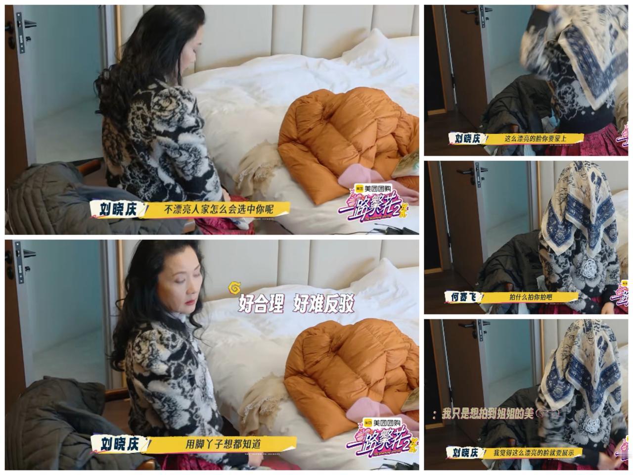 何赛飞为了阻止节目组怼脸镜头, 直接用丝巾盖住头部, 刘晓庆却 不认同。 何赛飞觉得节目组车上的镜头, 离自己太近, 把自己真实的皱纹什么的, 都拍得一清二楚, 于是她打算在车上不想被拍时, 就用丝巾把脸盖住。 对呀, 李沁也觉得节目组的镜头太讨厌了, 当她洗完澡准备休息一下, 结果她走到哪里, 镜头就转到哪里, 有些不好的状态都被拍到了。 那么她辛苦学到的化妆术, 为了维持美好形象这下全废了。 刘晓庆觉得何赛飞这样 是把美丽的脸盖住了, 强调节目请她来就是因为她的美丽, 女生是越来越好看的。 刘晓庆真的很会安慰人, 一直夸何赛飞美, 美得让人眼红。 她明明知道节目组 邀请她们这些上年纪的 女艺人参加节目, 是有其他原因, 却特别强调是 因为她们的美貌才请她们来的。 可见刘晓庆是很会自我催眠。 不过回头一想, 不同年龄段, 都有不同年龄段的美呀, 就算到刘晓庆这个年纪, 每一条皱纹都有“故事的美”呀。 何赛飞还没有到达刘晓庆的境界, 刘晓庆已经与自己的年纪和解了。 或者说她一直很“自恋”。 但是“自恋”不一定是贬义词, 刘晓庆用自己的行动 把这个词重新定义了。