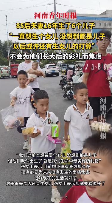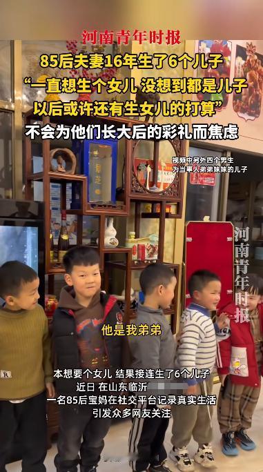 “这就是命啊!”11月9日报道,山东临沂一对85后夫妻,结婚12年生了6个孩子,竟然全都是儿子!夫妻俩本想着要个女儿,谁知却就是生不出来,网友:旱的旱死涝的涝死啊![熊猫] 山东临沂有户人家,张女士和贾先生结婚十二年,陆续生了六个孩子,全是男孩,从2013年大儿子出生到2024年最小的儿子降生,这个八口之家每天都很热闹。 夫妻俩最初也想要个女儿,但每次产检结果都是男孩,现在他们已经习惯了这样的家庭组合,不再纠结性别问题。 这个家每天早上要准备一大锅粥或面条才够吃,洗衣机一天要转好几次,衣服总是堆成小山,玩具刚收拾好,转身就又被扔得到处都是。 贾先生在县城开了家小餐馆,月收入一万多元,张女士在家带孩子之余做些手工活补贴家用,两份收入加起来,应付日常开销还算够用。 六个孩子的衣服从老大往下传,玩具也是共用的,餐馆里新菜品研发出来,六个儿子口味各不相同,正好可以试吃,这些生活细节让开支控制得比较好。 目前大儿子11岁,上小学五年级,最小的儿子才几个月大,还在襁褓中,他们的打算是等孩子们长大工作后,兄弟几个一起想办法,可以在县城合买小户型,或者一起出钱建房。 邻居们都说这家孩子虽然多,但个个都懂事,大儿子放学后帮忙照看弟弟们,二儿子经常在厨房帮忙洗菜切菜,三儿子负责喂鸡喂鸭。 老大教老二写作业,老三摔倒了老四立马扶起来,兄弟之间相互照应,分担了父母不少压力,这种互帮互助在独生子女家庭是很难看到的。 县城的生活成本相对较低,孩子们上的都是公立学校,学费不贵,平时买菜做饭比在外面吃便宜很多,餐馆正好能解决食材采购。 六个男孩一起长大,家里每天都像个小战场,兄弟之间难免有争吵打闹,抢玩具是常事,但吵完闹完,很快又能和好如初。 这种热闹的氛围也给这个家带来很多欢乐,周末一家人去公园,六个孩子在草坪上奔跑嬉戏,场面很是壮观,过年过节时,一大家子围坐在一起更显温馨。 看了山东临沂这个六子之家的故事,评论区真是比他们家还热闹。 有网友调侃说:“这家里是有什么生男孩的祖传秘方吗?简直是‘建设银行’顶级VIP客户啊!”  更有人直言:“养一个娃我都快散架了,这位妈妈是超人吗?光是每天叫六遍起床,我都觉得是个巨大工程。” 有网友算了一笔账:“眼前六个孩子的吃穿用度、教育培养,这开销想想都头皮发麻,父母真的太伟大了。”  不少人评论说:“儿孙自有儿孙福,现在操心二十年以后的事确实太早,人家一家人其乐融融,这种手足亲情是多少钱都买不来的财富。”  不少网友分享了自己的经历,找到了共鸣,“我家就是三个男孩,那场面简直了,每天像在打仗,但看到他们兄弟几个有商有量、互相维护的时候,又觉得一切都值了。”  那么对于这件事情,您有什么想说的呢? 信息来源:河南青年时报