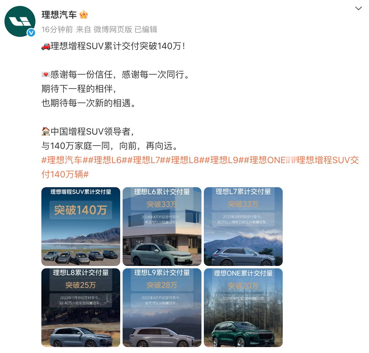 宣布,理想汽车增程SUV累计交付突破140万。其中理想L6累计突破33万,L7累计突破33万,L8累计突破25万,L7累计突破28万,最早的理想ONE车型累计突破20万。