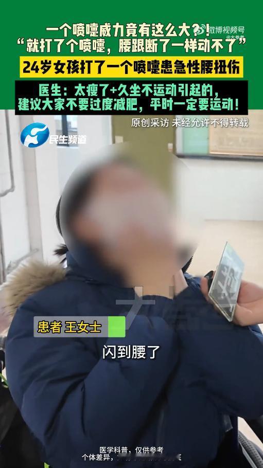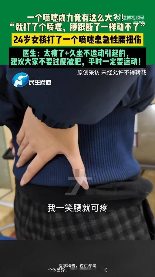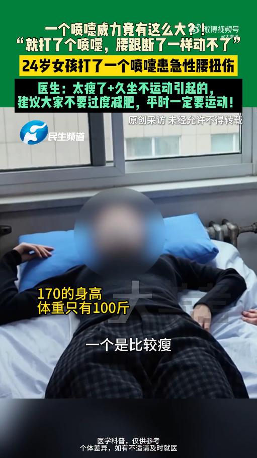 “悲剧还是发生了!”11月7日报道,河南郑州一女子打了个喷嚏,随后腰部传来“咔嚓”一声脆响,接着整个人跪在了地上,怎么起都起不来!送往医院后经检查,女子这是急性腰扭伤,主要还是因为她太瘦了。[熊猫] 郑州的王女士前几天在办公室打了个喷嚏,腰部突然“咔”地响了一声,紧接着疼得她直接跪在了地上,同事赶紧把她送到医院,医生检查后说是急性腰扭伤。 王女士身高1米7,体重只有100斤,医生问了她的日常饮食和运动习惯后,指出问题的关键,体重太轻,肌肉力量不够,连打喷嚏这种突然发力的动作都承受不住。 王女士说,她从大学开始就一直在减肥,虽然现在BMI指数在正常范围,但她总觉得自己还不够瘦,每天只吃一顿正餐,晚上基本不吃主食,偶尔饿了就吃点水果。 这样的饮食习惯持续了快五年,她确实瘦下来了,但体力明显不如从前,上个月公司体检,骨密度检测结果显示偏低,医生当时就提醒她要注意补钙和锻炼,但她没太当回事。 接诊王女士的骨科医生说,最近几年像她这样的年轻患者越来越多,很多女孩子BMI正常甚至偏低,却还在拼命节食,结果体重是轻了,但肌肉量和骨密度都跟着下降,身体反而变脆弱了。 医生举了个例子:人体的核心肌群就像房子的承重墙,负责支撑和稳定脊柱,如果这些肌肉太薄弱,遇到突然的外力冲击,比如打喷嚏、咳嗽、转身,腰椎就容易受伤。 适量的脂肪也有缓冲作用,太瘦的人脂肪层薄,骨骼和关节之间的保护垫不够,磕碰或跌倒时更容易受伤,有些女生追求“骨感美”,结果骨头真的变脆了。 王女士住院期间,隔壁床住着一位30岁出头的姑娘,她是在健身房做深蹲时突然站不起来,送到医院发现腰椎间盘突出,原因也是长期节食加上运动前不热身,肌肉力量跟不上。 出院后王女士开始调整生活方式,她先咨询了营养师,制定了一份适合自己的饮食计划,早餐增加了鸡蛋和牛奶,午餐保证有鱼或鸡肉,晚餐也不再只吃蔬菜,会搭配一小碗杂粮饭。 饮食调整的同时,她还报了私教课,教练先给她做了体测,发现她的体脂率虽然低,但肌肉含量也很低,核心力量几乎为零,教练给她设计了循序渐进的训练计划,从最基础的平板支撑开始练起。 第一次做平板支撑,王女士只坚持了15秒就浑身发抖,教练说这很正常,慢慢来就好,现在两个月过去,她已经能支撑1分钟,腰腹明显有力量了。 除了平板支撑,教练还教了她几个在家就能做的动作,小燕飞可以锻炼腰背肌肉,每天趴在瑜伽垫上做三组,每组15个,臀桥能练到臀部和大腿后侧,对保护腰椎也很有帮助。 王女士说,现在她不再盯着体重秤上的数字了,虽然体重比之前增加了5斤,但整个人的精神状态好多了,走路也有劲儿了,最重要的是,打喷嚏不用担心闪腰了。 看了郑州王女士因为一个喷嚏就把腰给扭伤的消息,感觉真是又心疼又意外,这事儿在头条上引起了挺多朋友的讨论。 有网友说:“我深有体会!去年我就是弯腰捡个东西,一下就动不了了,在床上躺了三天,我也是偏瘦,现在真信了,瘦不代表身体好,有点肌肉才是硬道理。”  还有网友说:“好吧,这下终于有光明正大的理由了,不是我不减肥,是我在为我的腰椎积攒‘缓冲垫’!”  也有网友分析说:“这事儿不能全怪‘瘦’,核心肌肉力量不足才是关键,很多人光节食不运动,体重是下来了,但肌肉也流失了,身体稳定性变差,很容易受伤。”  那么对于这件事情,您有什么想说的呢?   信息来源:大参考