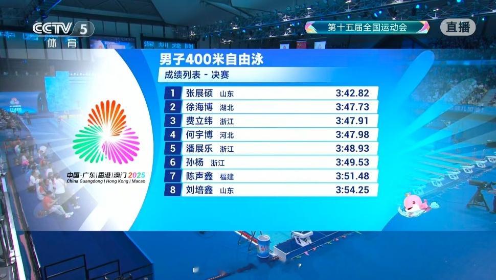 第十五届全运会游泳男子400米自由泳决赛,张展硕游出3分42秒82夺得金牌,打破世界青年纪录。