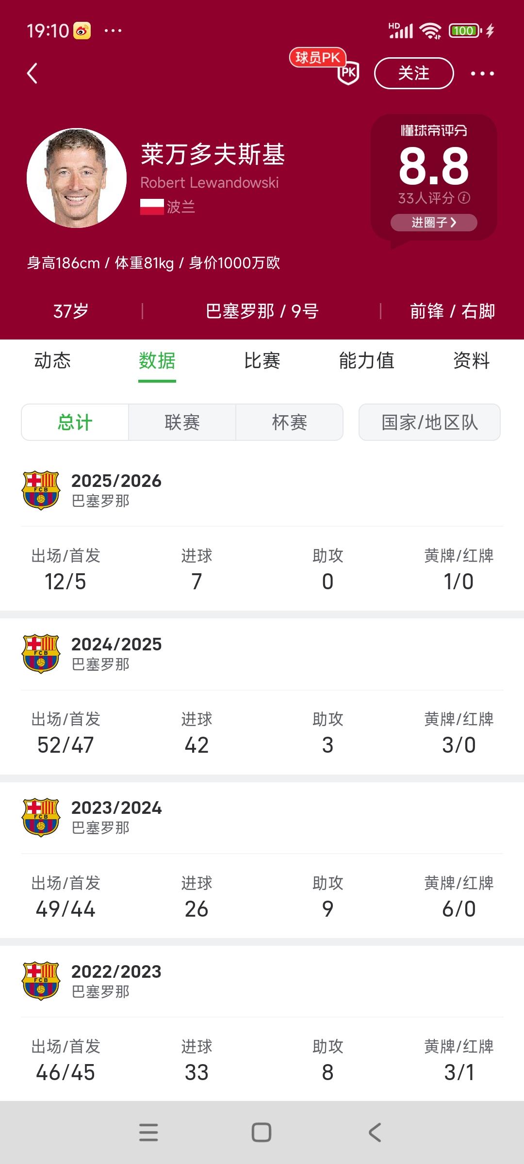 莱万只要给点机会就进球,所以有9分钟5球神技。 本赛季首发5次打进7球,跟姆巴佩,哈兰德,凯恩比不了,其他前锋谁比莱万强? 巴萨买他的时候年龄就很大了,明年真的38岁顶级联赛很难啦,其实巴萨也舍不得。 这样一名超级前锋真不在,买谁呀!![可怜]