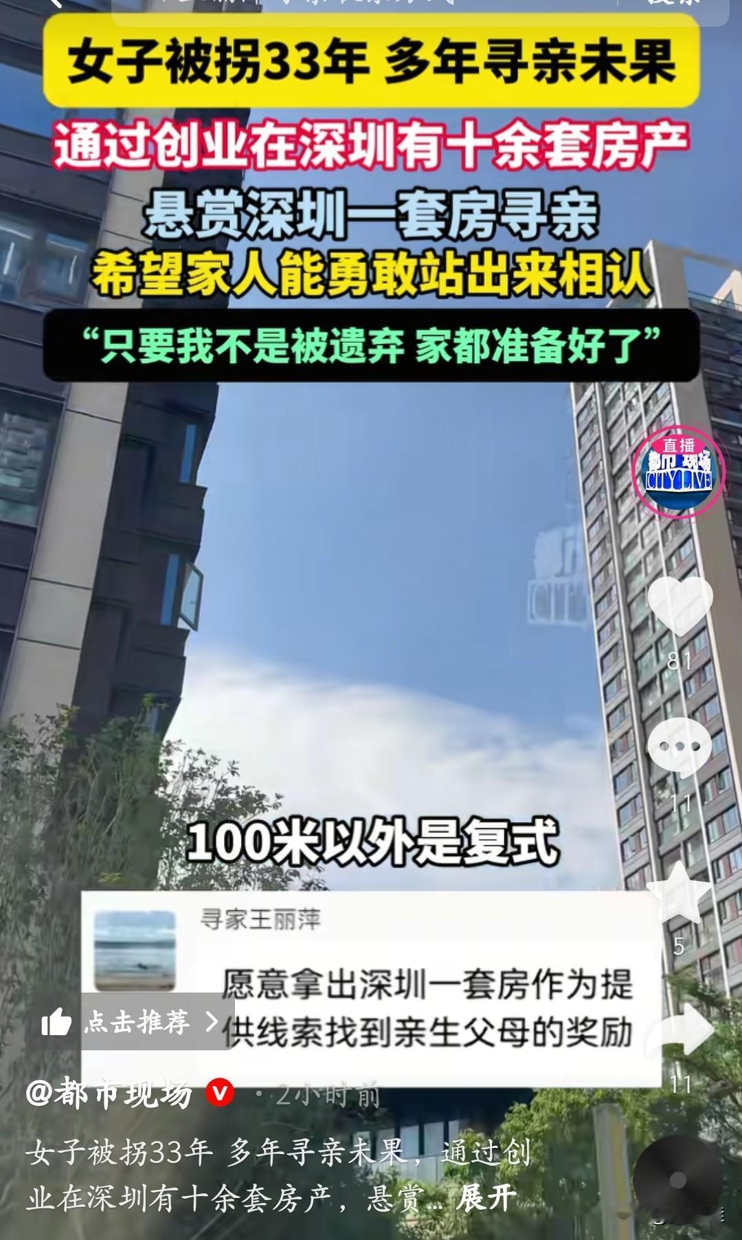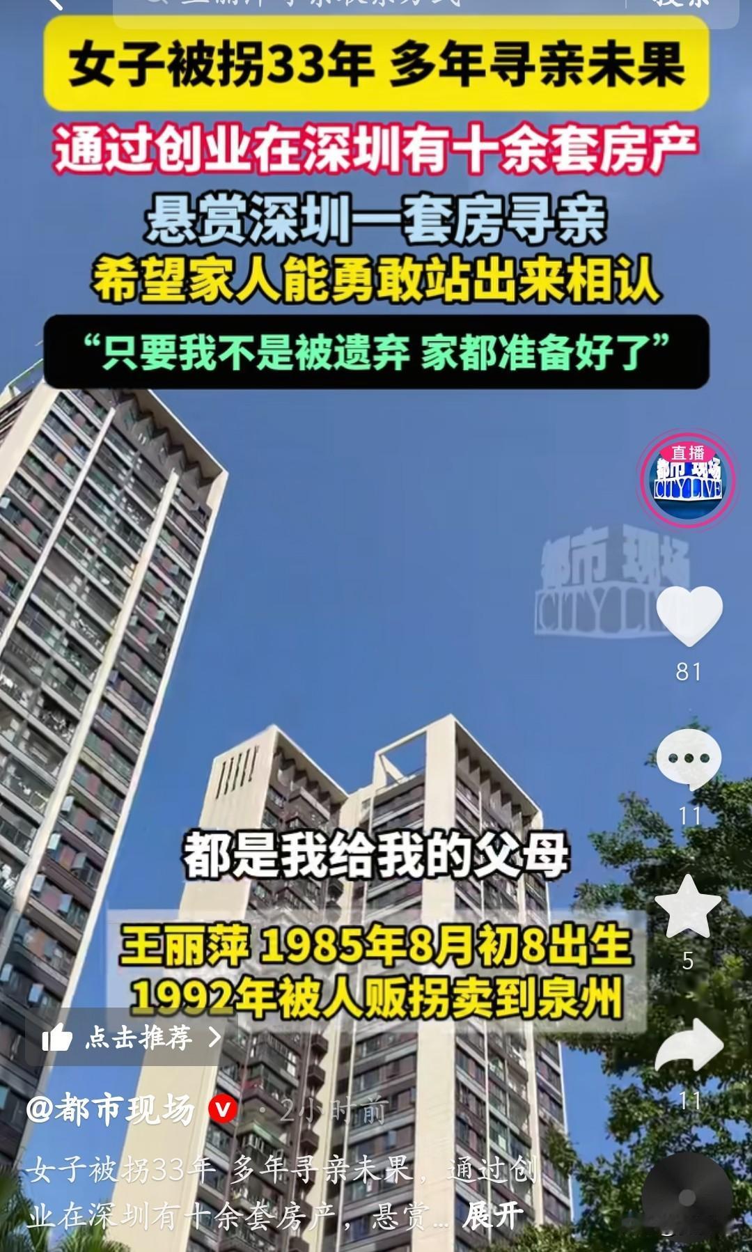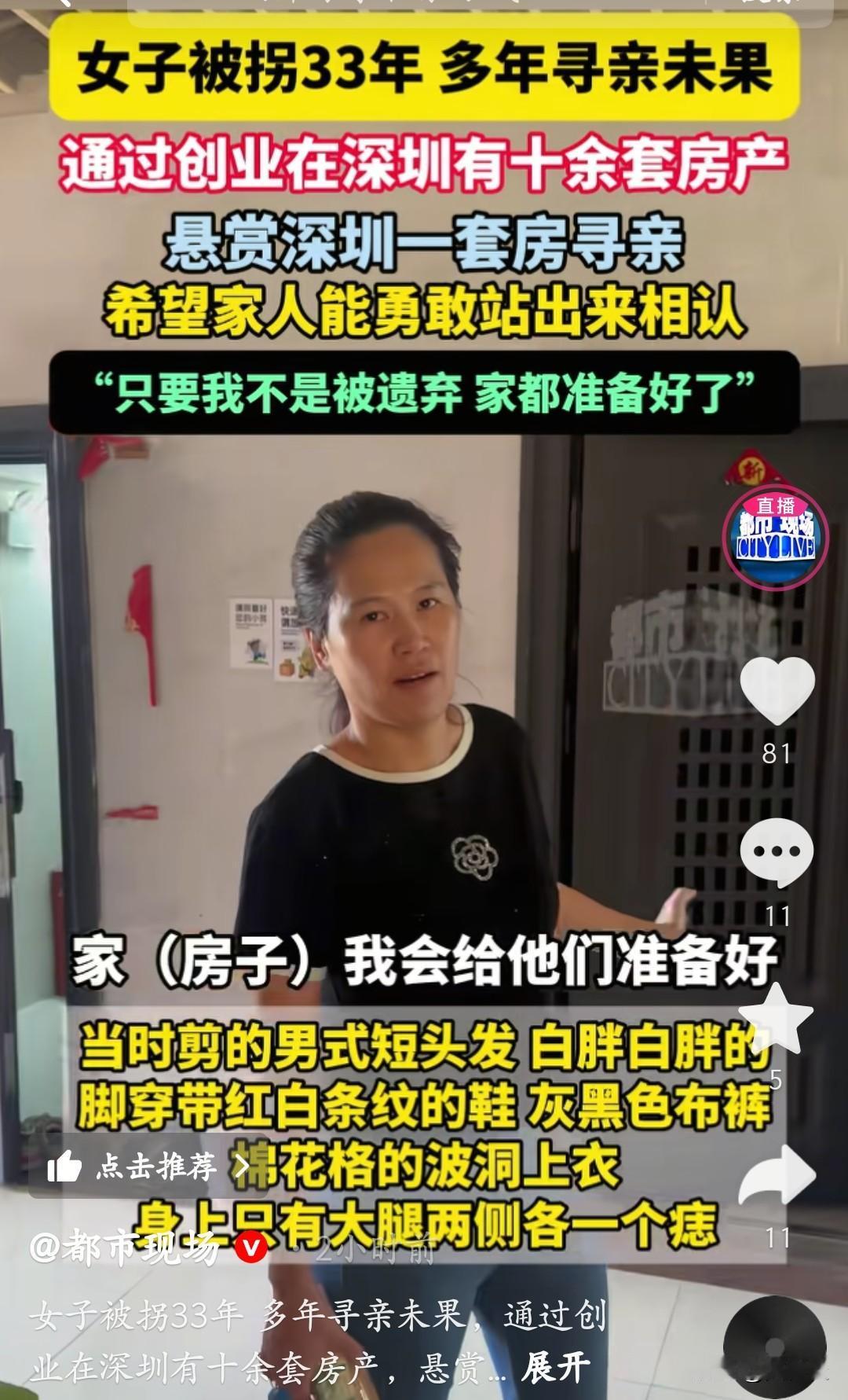 王丽萍7岁被拐到泉州,如今在深圳拼出十几套房产,却把最大的执念攥在“寻亲”上。她对着镜头说:“只要不是被爹妈扔的,深圳的房直接给他们,家早准备好了。” 她记得当年是男式短发,穿红白条纹鞋、灰黑布裤,大腿两侧各有颗痣,这些碎记忆攒了33年。现在她把深圳房产当悬赏,不是炫富,是赌一个“没被放弃”的答案:“我就想知道,当年是不是有人像我找他们一样,找过我?”
