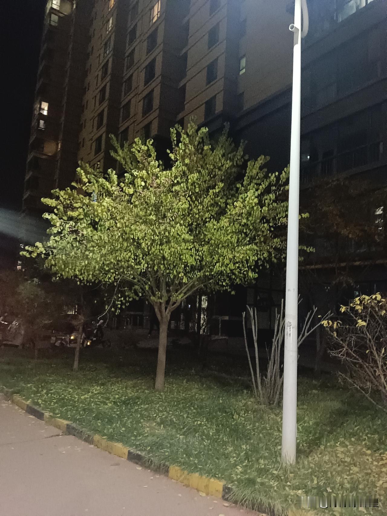 晚上遛弯儿,楼底下那棵小树被路灯裹得暖乎乎的,叶子泛着嫩生生的绿。风一吹,碎影子晃在草皮上,混着几片黄叶子打旋儿。旁边电动车闪着小灯,楼里亮的窗像块块糖。秋夜裹着点凉,可这软乎乎的光裹过来,步子都慢了半拍,怪舒服的。