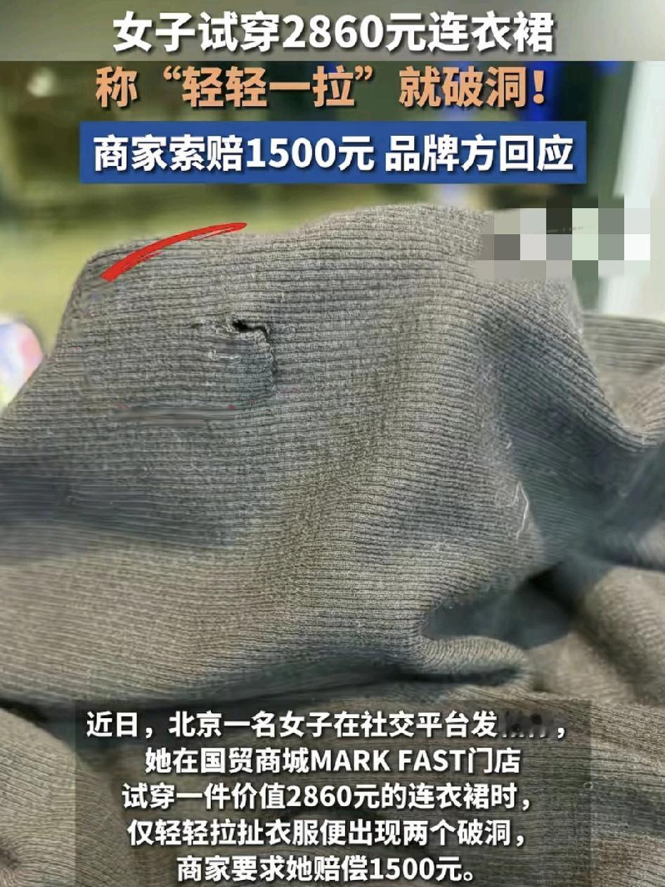 北京一女子发视频称在一商城的服装店试穿一件价值2860元的衣服,没想到轻轻一拉衣服上面就出现两个洞。商家要求赔偿1500块钱,女子表示这是衣服本身质量问题,自己并没有留长指甲衣服也没有接触过任何尖锐的东西,商家却要求女子留下身份证号码准备起诉,女子则向12315进行投诉。价值这么高的衣服,却禁不住轻轻一拉。如果这也是客人的问题,那么谁还敢在实体店试穿衣服。
