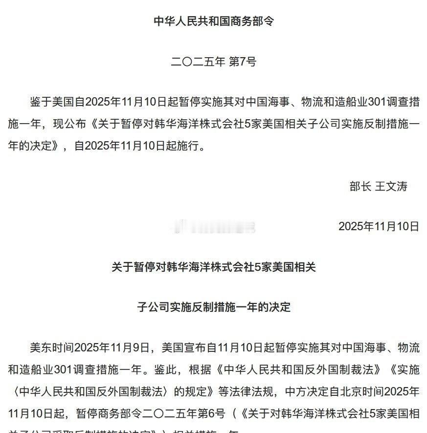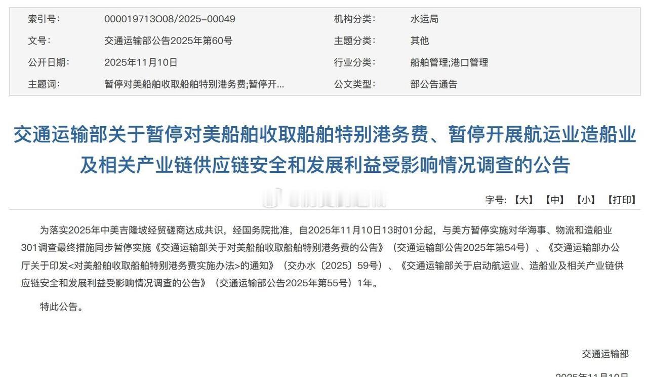 美国贸易代表办公室(USTR)发布公告,宣布暂停针对中国海事、物流及造船业的301调查相关措施一年,当地时间11月10日凌晨12时01分起生效。 中国交通运输部也宣布暂停对美船舶收取船舶特别港务费、暂停开展航运业造船业及相关产业链供应链安全和发展利益受影响情况调查一年,11月10日13时01分起生效。中国商务部宣布暂停对韩华海洋株式会社5家美国相关子公司实施反制措施一年。
