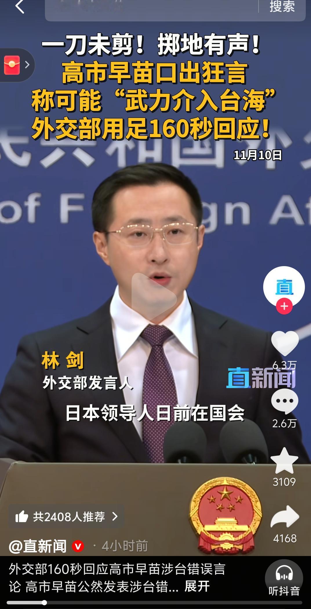 日本高市早苗公然发表涉台错误言论,暗示中国若武力收复台湾,可能威胁日本安全,日本可能以武力介入台湾。日本纯粹是为了扩张武力拿台湾当借口,台湾是中国不可分割的一部分,以何种方式解决台湾问题、实现国家统一,纯属中国内政,日本以及外部势力无权指手画。 对此,外交部那160秒的回应掷地有声!直接点明高市早苗的言论粗暴干涉中国内政、严重违背一个中国原则,中方强烈不满且坚决反对,还向日方提出严正交涉。更让人振奋的是,发言人明确表示中国终将统一,中国人民有坚定意志、充分信心和足够能力,粉碎一切插手和阻挠中国统一大业的图谋。中国维护国家主权和领土完整的决心,绝不是说说而已!