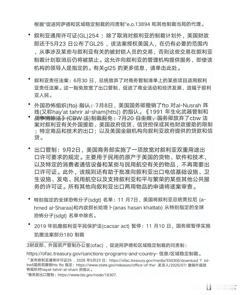 美国财政部: 美国已不再对叙利亚实施全面制裁。 《凯撒法案》已被暂停实施,美国民用商品、通信设备和一些民用航空设备不再需要许可证即可出口到叙利亚。