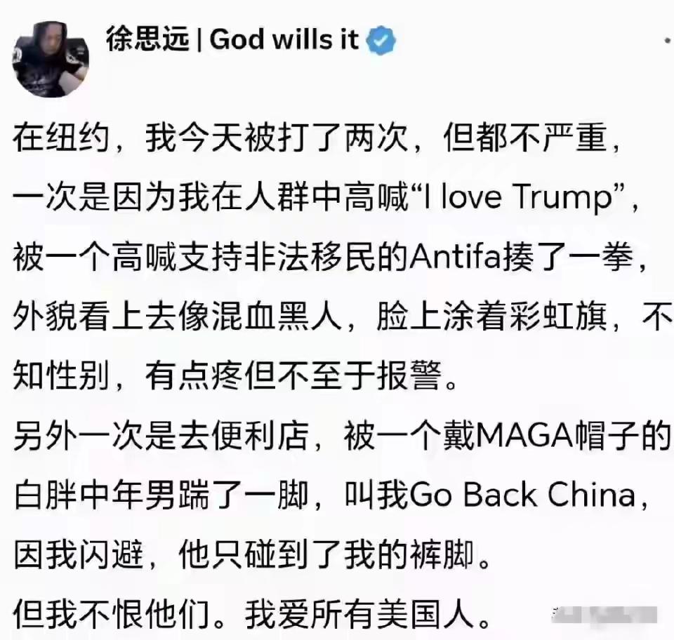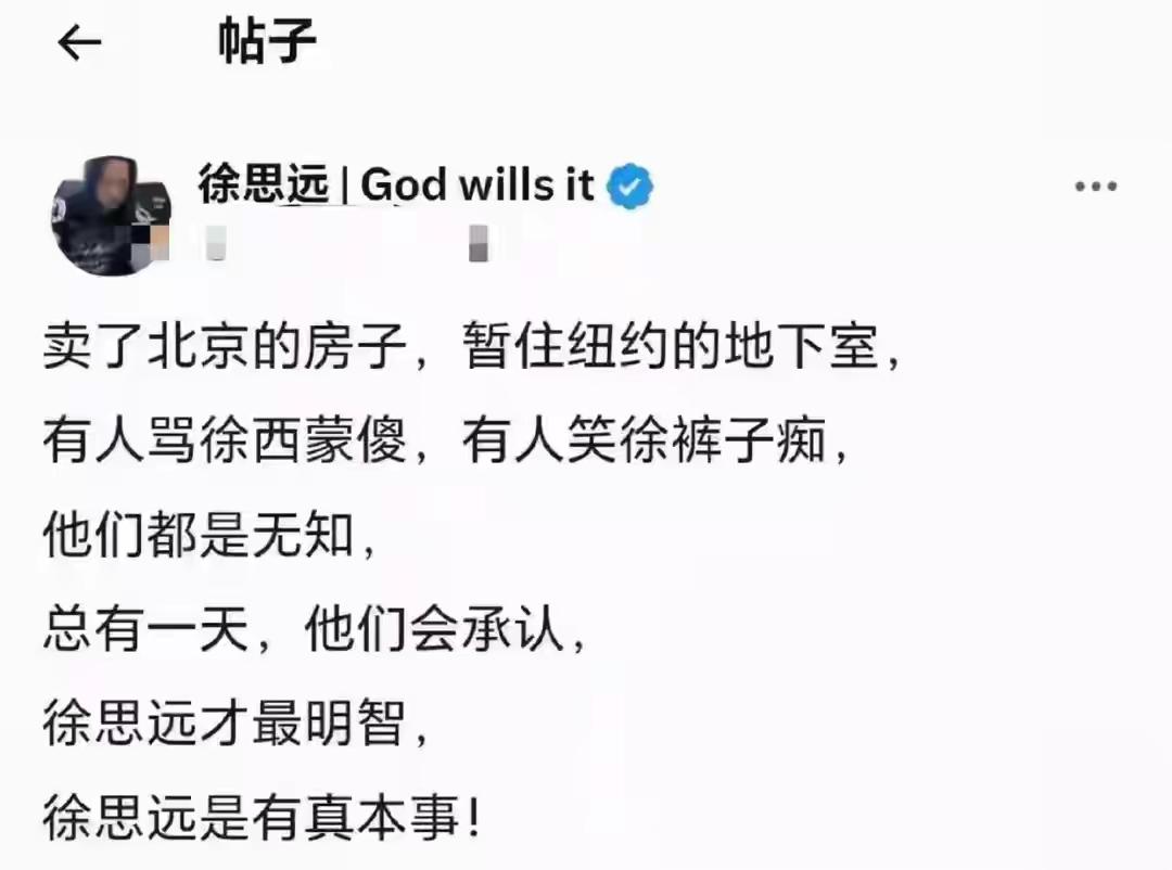 住在纽约地下室、艰苦度日多年的润人代表徐思远,在11月7日发表一篇推文,声称自己