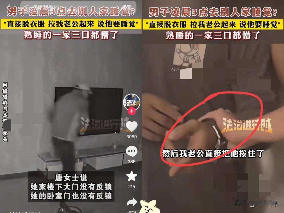 江苏,唐女士和老公正在家睡觉,突然一陌生男子闯进卧室,一边脱衣服裤子,一边将唐女士丈夫拉起来,还薅着她老公喊“起来,这是我家”! 还好丈夫反应快按住醉汉,唐女士吓得魂飞魄散,赶紧跑出去报警! 更气人的是,醉汉还恶人先告状,说“能开门就是我家”,简直刷新三观! 醉酒从来不是作恶的挡箭牌,非法侵入他人住宅,情节严重可是要判三年以下有期徒刑的! 这事也给大伙敲警钟:睡前房门必须反锁,普通执手锁赶紧换成防盗C级锁,别给坏人留可乘之机! 大家对此怎么看?