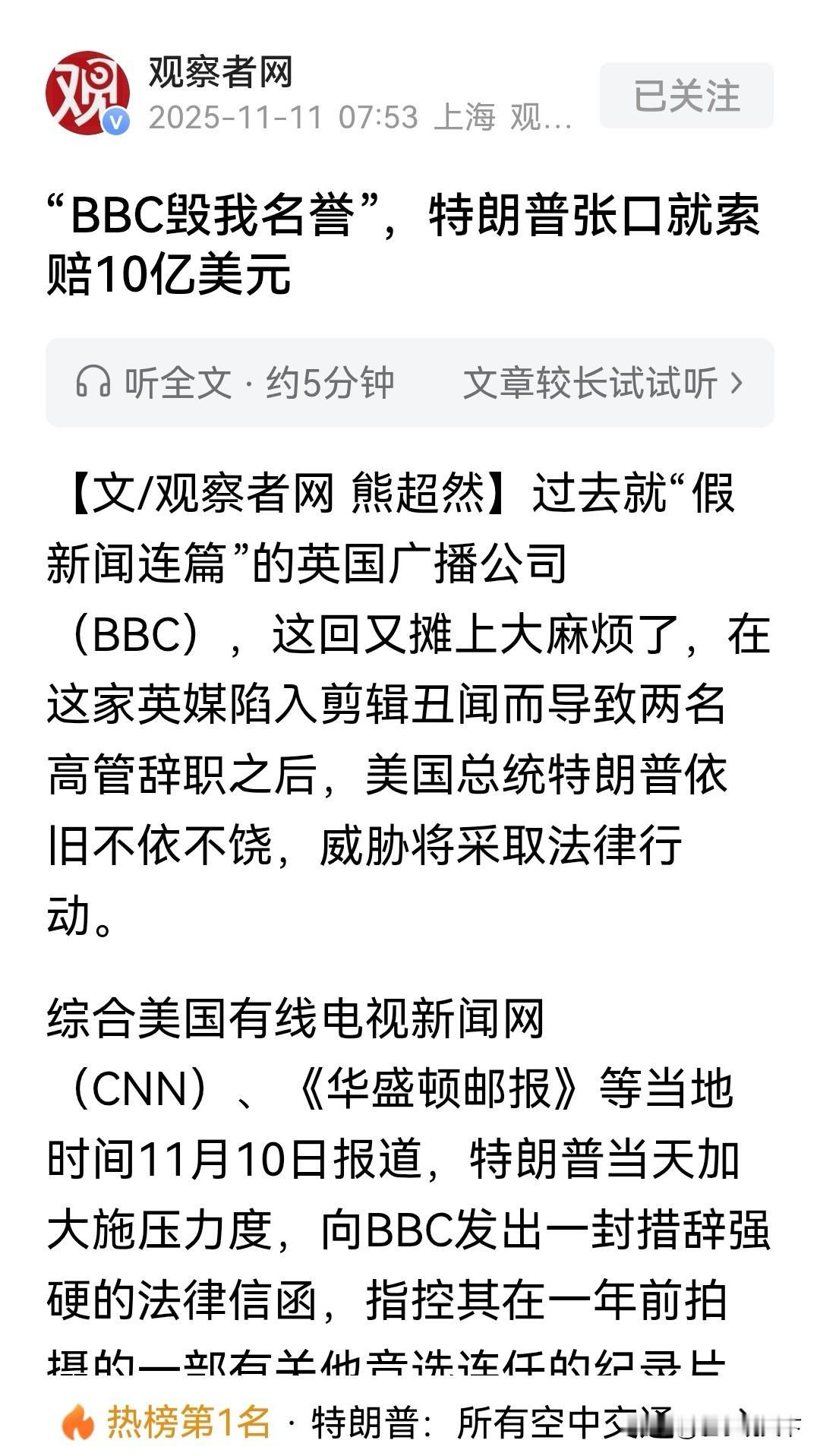 BBC这波操作也太离谱了! 为了黑特朗普, 居然恶意剪辑他的演讲,把相隔近一小时的内容拼一起,硬说他煽动国会山骚乱,这不纯纯造谣嘛! 特朗普哪儿能忍这口气,直接发了强硬信函,张口就要10亿美元赔偿,还要求BBC撤回纪录片、公开道歉,给了个11月14日的最后期限! 现在BBC俩高管都辞职了,主席也道歉了,但特朗普看样子是要刚到底,毕竟他之前告其他媒体也拿到过巨额赔偿,这次怕是不会轻易罢休! 特朗普怒怼