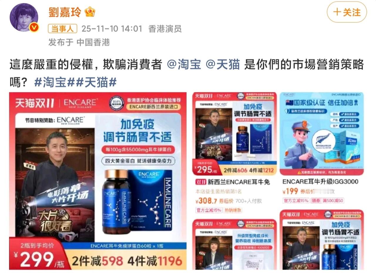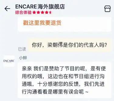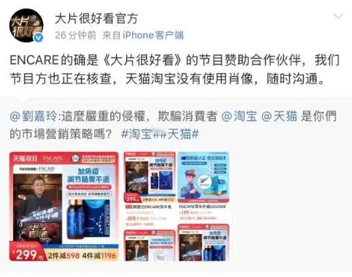 不懂就问,参加了《大片很好看》的艺人,都能成为这个赞助商Encare的代言人吗?参加综艺节目就意味着接了代言?这是什么逻辑?显然,刘嘉玲应该不知道吧。看样子要么是淘宝店铺的问题,要么是节目组的问题。淘宝回应被刘嘉玲喊话侵权