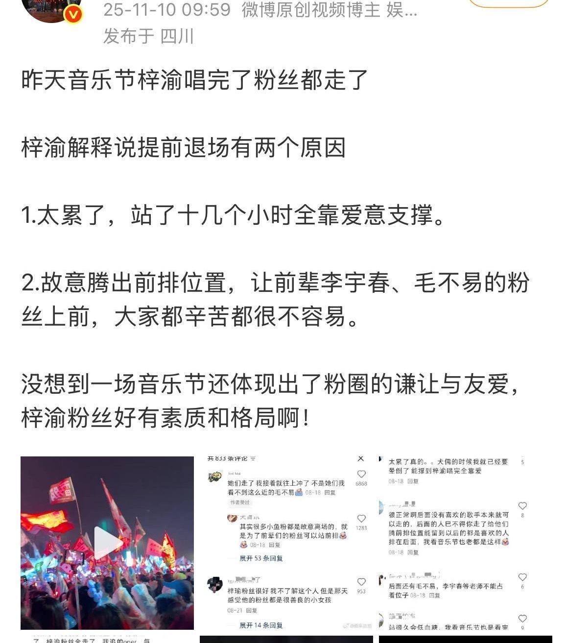 虽然但是,梓渝和李宇春毛不易不在同一场音乐节啊,所以是怎么让位置的啊[揣手]