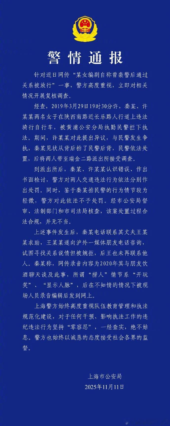 警方通报编剧秦雯自称袭警捞人 网传“某女编剧自称曾袭警后通过关系被放行”,上海警方发布警情通报。省流就是,秦大编剧喝多了口嗨结果被人当真了,这该死的虚荣心。