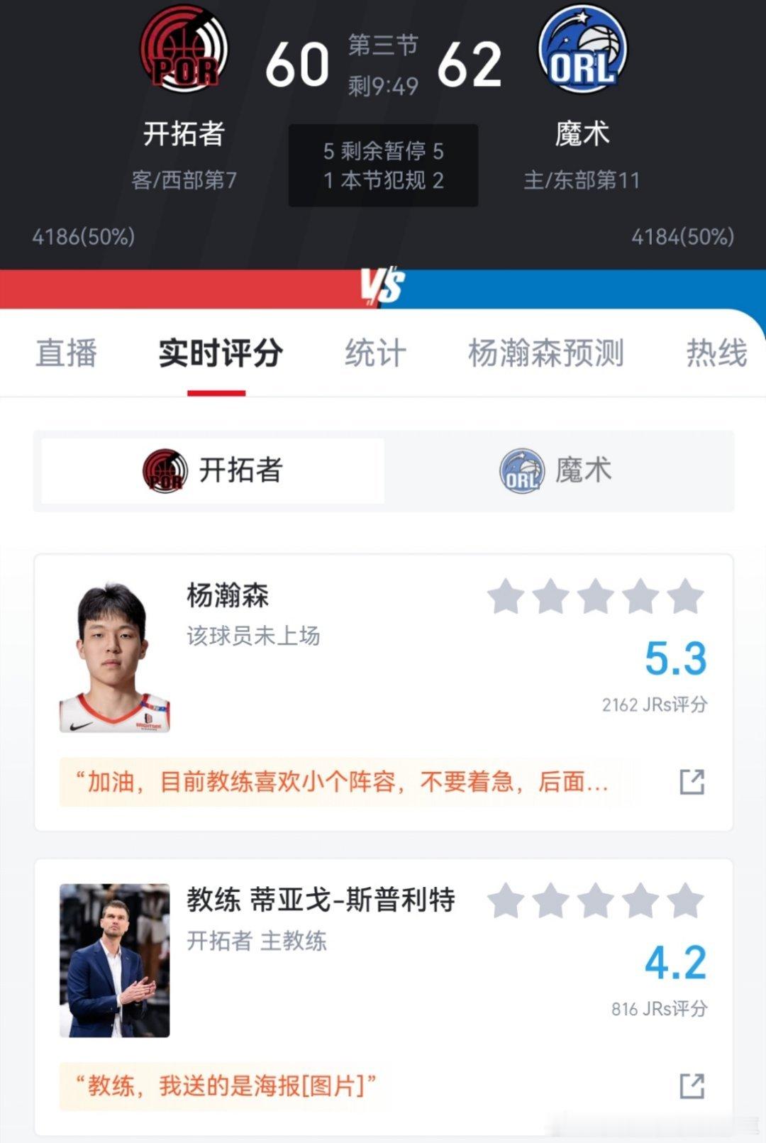 开拓者和魔术打到第三节了,杨瀚森还是没有上场,已经连续dnp四五场了,咋不送到发展联盟练练呢,今天罗威里斯一起上的阵容都有了,就是不上杨瀚森,比卢普斯下课对杨瀚森来说不是一件好事