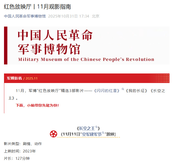 【军博放映王一博长空之王】 长空无垠,探索极限,向着更高更远持续腾飞。中国人民革命军事博物馆发布《红色放映厅丨11月观影指南》,其中,由主演的《长空之王》于11月11日“空军建军节”放映。一起回顾经典剧照,来说说,片中哪一幕最让你最难忘?