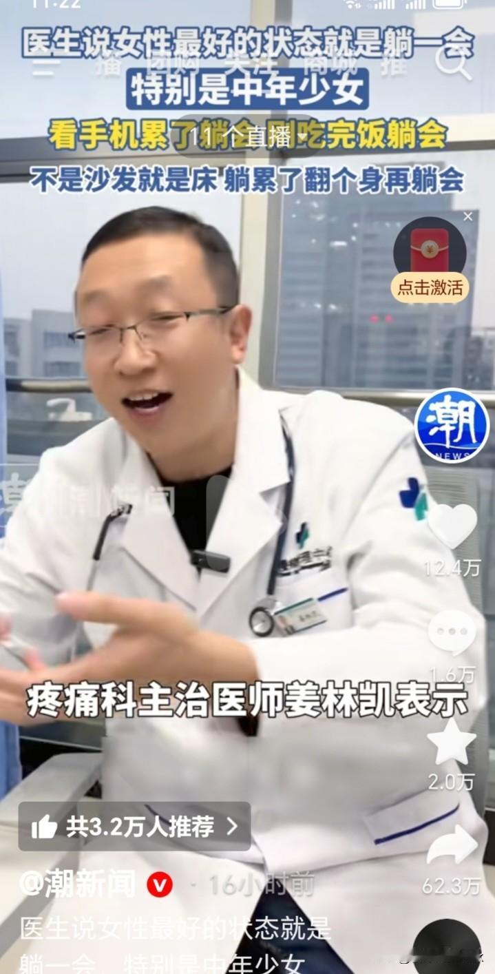 “女性最好的状态就是躺一会,特别是中年少女,不是沙发就是床,躺累了翻个身再躺会”,专家这话说到了女人心坎,以后谁不让我躺,我就跟谁急。 近日,山东东营市人民医院疼痛科主治医师姜林凯说,“女性最好的状态就是躺一会,尤其是中年少女。早晨醒来刷手机累了,躺一会;刚在外面回到家累了,躺一会;刚吃完饭,刚撂下筷,躺一会;刚洗完澡,躺一会;刚拖完地,收拾完屋子,躺一会;陪着孩子写作业,也躺一会。反正不是床就是沙发,躺累了翻个身再躺会。” “中年少女”,男女一听都笑喷,真是会顺应时代,识时务,女人最喜欢听这称呼。 动一下,躺一下,这不是林黛玉吗?确定不是躺多了惹的祸?越躺越想躺,躺着躺着就起不来。 有人说,神医啊,这一听就是专家。 还有女人说,我以前总想躺,还认为是自己懒,这下我躺得理直气壮了,谁不让我躺,跟谁急。 也有人说,我就是这么躺的,感觉病恹恹的,做点事就想躺。 我觉得,专家的话也不能全对,也不应该仅仅针对女人,男人也不是钢铁侠。每个人的身体体质也不一样,劳动強度也不一样,累了可以坐下休息,也不能一天躺个几次,还躺累了翻个身再躺,躺多了真是越躺越不想动,都说人老先老脚,不想动以后就躺下了。
