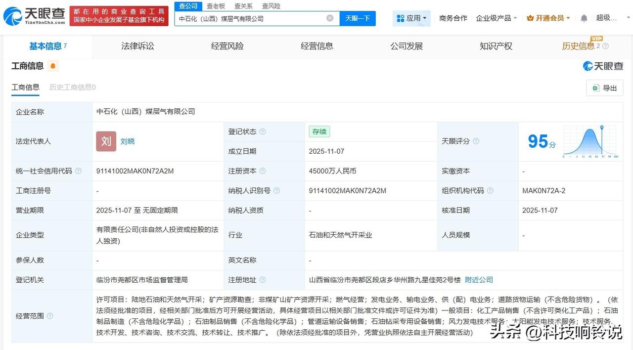 【中石化在山西成立煤层气公司 注册资本4.5亿】 天眼查工商信息显示,近日,中石化(山西)煤层气有限公司成立,法定代表人为刘晓,注册资本4.5亿人民币,经营范围包括陆地石油和天然气开采、矿产资源勘查、非煤矿山矿产资源开采、燃气经营等。股东信息显示,该公司由中国石化(600028)全资持股。 天眼查信息:
