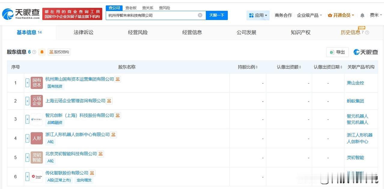 【蚂蚁集团、智元机器人等成立传智未来科技公司 注册资本2000万】 天眼查工商信息显示,近日,杭州传智未来科技有限公司成立,法定代表人为傅建烽,注册资本2000万人民币,经营范围包括人工智能基础软件开发、人工智能应用软件开发、人工智能理论与算法软件开发等。股东信息显示,该公司由蚂蚁集团旗下上海云玚企业管理咨询有限公司、智元机器人关联公司智元创新(上海)科技股份有限公司、浙江人形机器人创新中心有限公司、传化智联(002010)等共同持股。 天眼查信息: