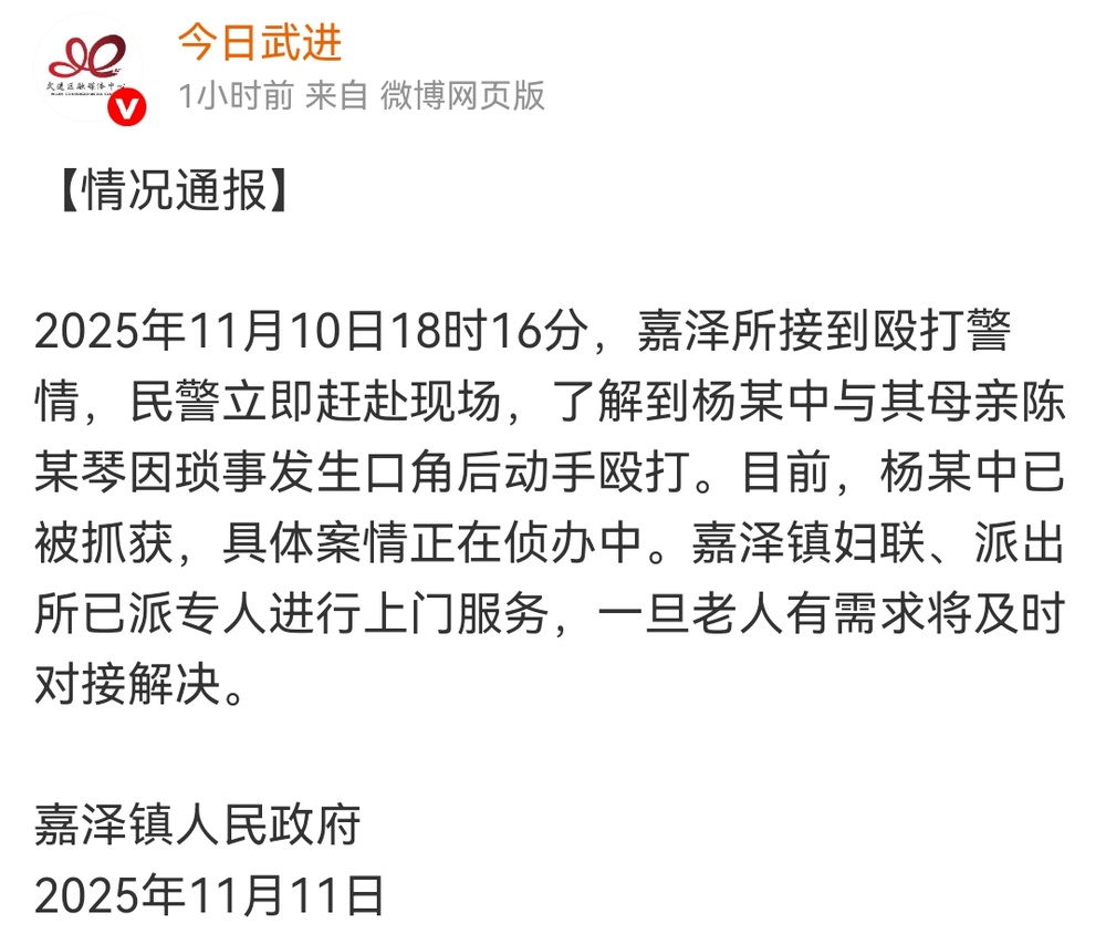 11月11日下午,@今日武进发布情况通报称:2025年11月10日18时16分,嘉泽所接到殴打警情,民警立即赶赴现场,了解到杨某中与其母亲陈某琴因琐事发生口角后动手殴打。目前,杨某中已被抓获,具体案情正在侦办中。嘉泽镇妇联、派出所已派专人进行上门服务,一旦老人有需求将及时对接解决。