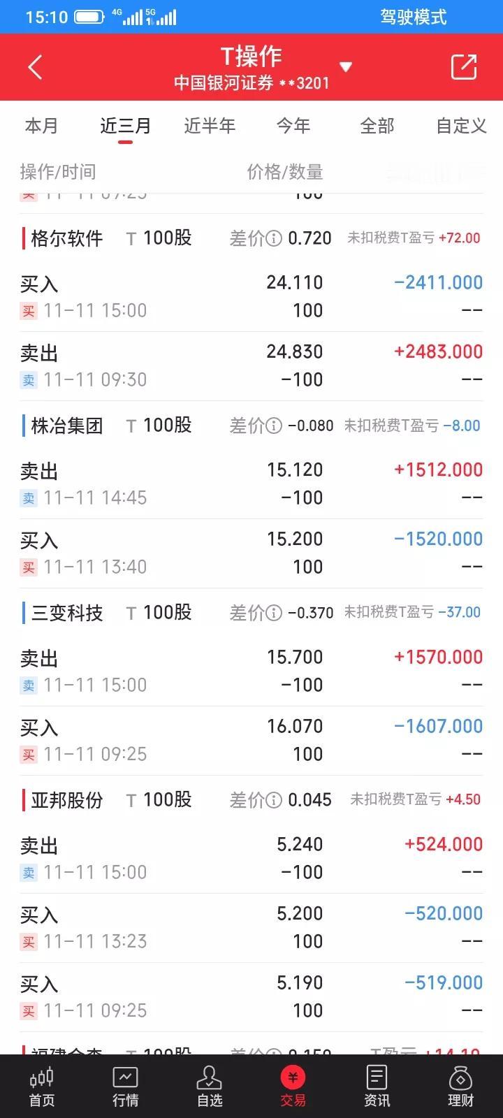 2025.11.11,今天t了100股方大,赚63元,t了100股立方,亏了6块钱,t了100股盛泰,亏了10块钱,t了200股福建水泥,赚88元,t了100股格尔,赚72元,t了100股株冶,亏了8块钱,t了100股三变,亏了37元,t了100股亚邦,赚4块钱。一共赚172元,印花税4.8元,佣金2元左右,净赚165元,也当做了一天日结吧。