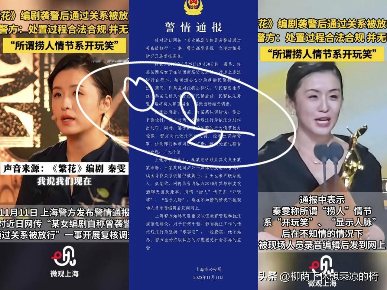 “只是酒后吹牛皮?” 上海警方刚通报秦雯“袭警被捞”事件,这反转真让人跌破眼镜!所谓“一个电话打通所长关系”,居然只是喝酒时吹牛显人脉的玩笑话。 事实是2019年她和朋友违法骑车被查,拍了民警后背,认错检讨后受了相应处罚,想找关系说情还被拒了,全程没任何“特权操作”。 最该深思的不是事件本身,而是有些人总把“靠关系”当谈资,仿佛能走后门是多值得炫耀的事,这种扭曲的价值观比偶尔犯错更可怕。 法律面前本就人人平等,哪来那么多“特殊通道”? 警方的通报也给所有人提了醒:别拿违法和特权当玩笑,更别把吹牛当炫耀,免得牛皮吹破里外不是人! 秦雯 秦雯袭警 秦雯编剧 秦仪雯 上海袭警