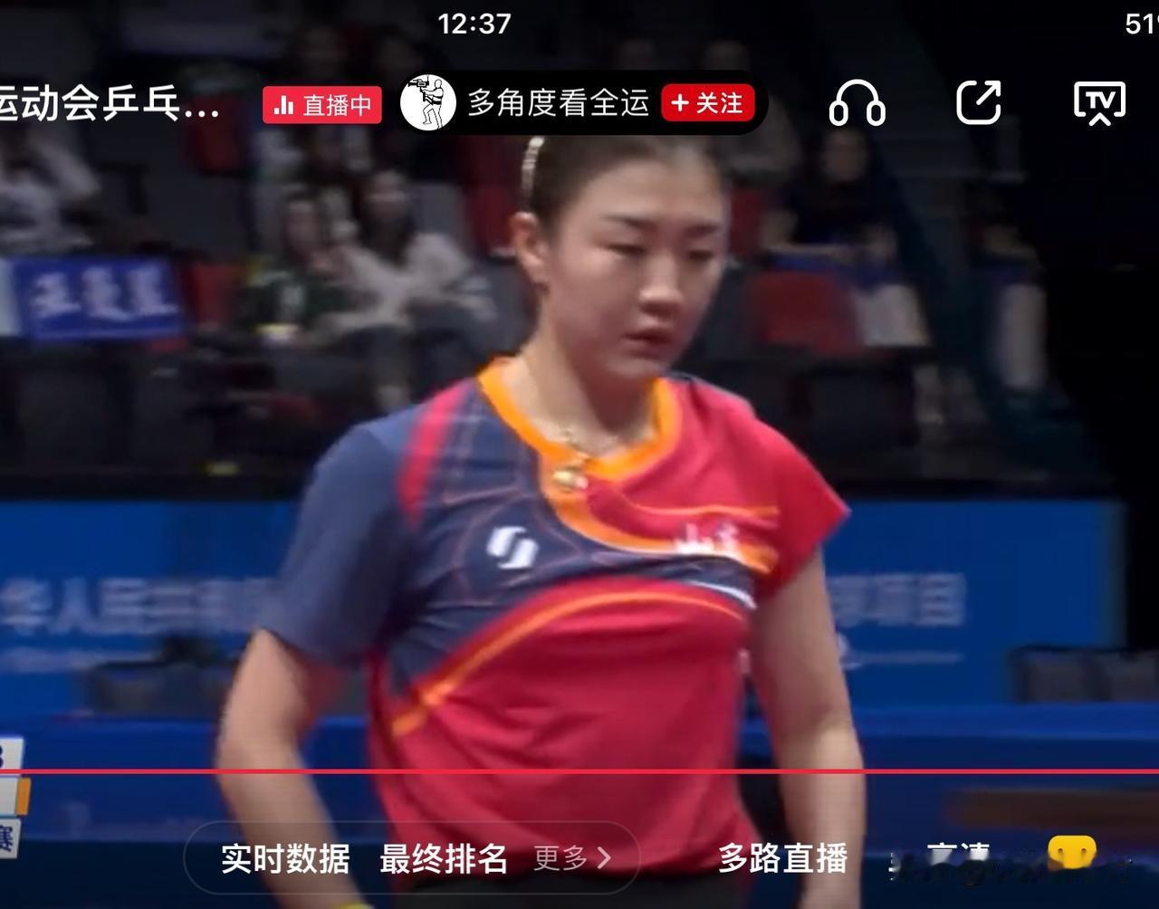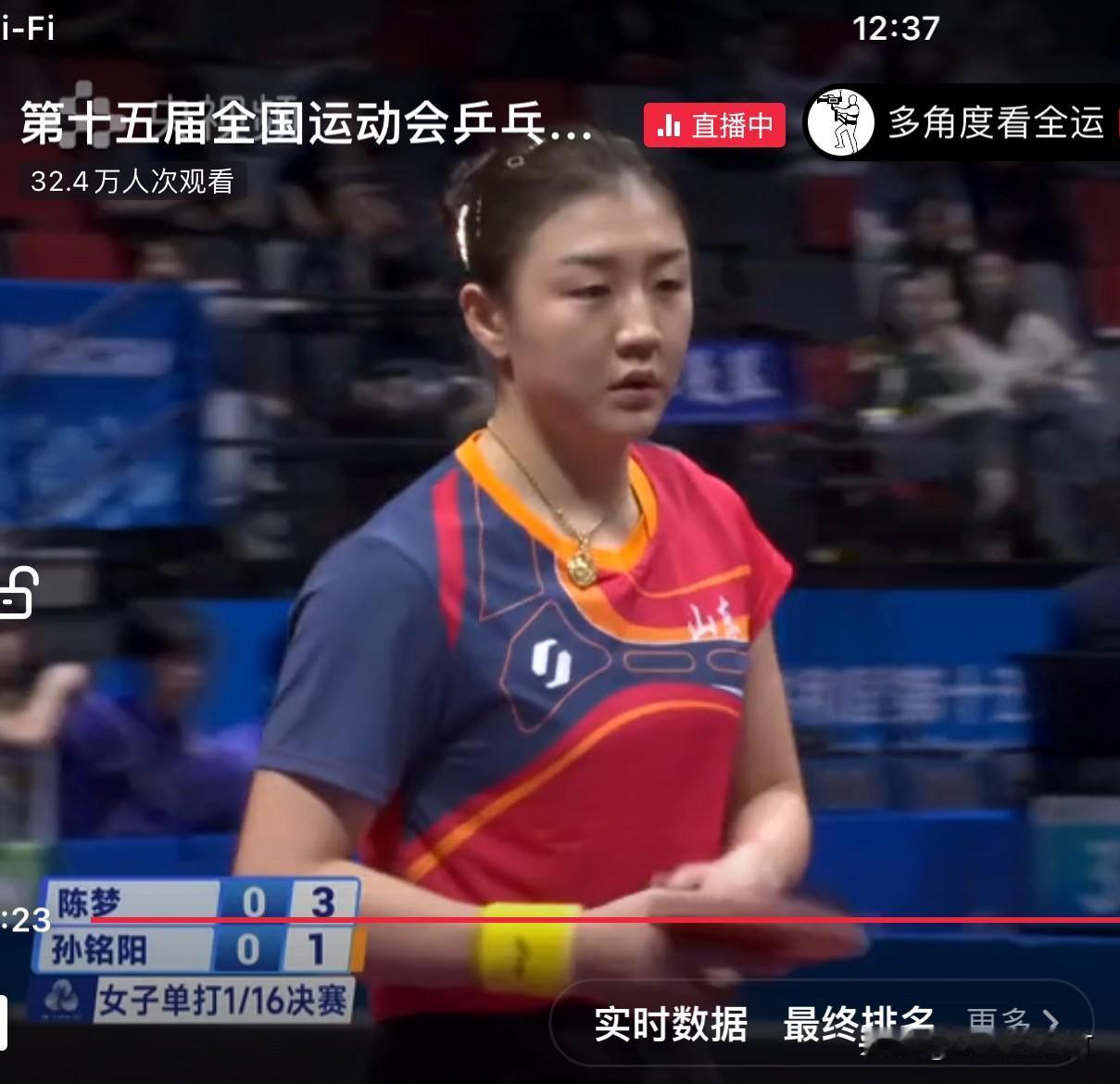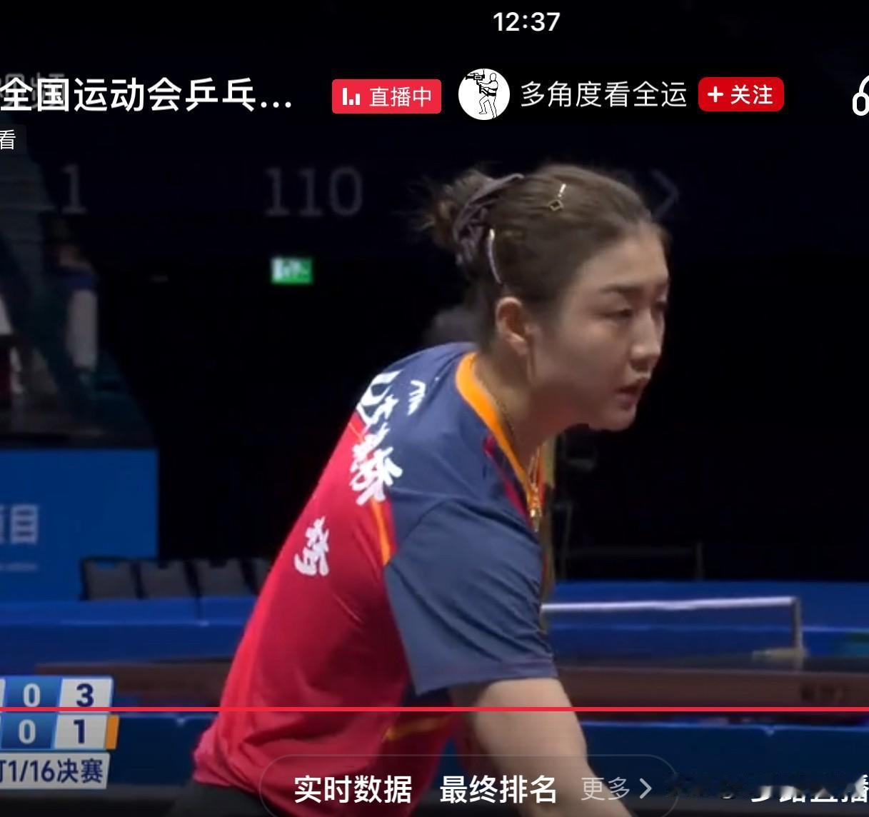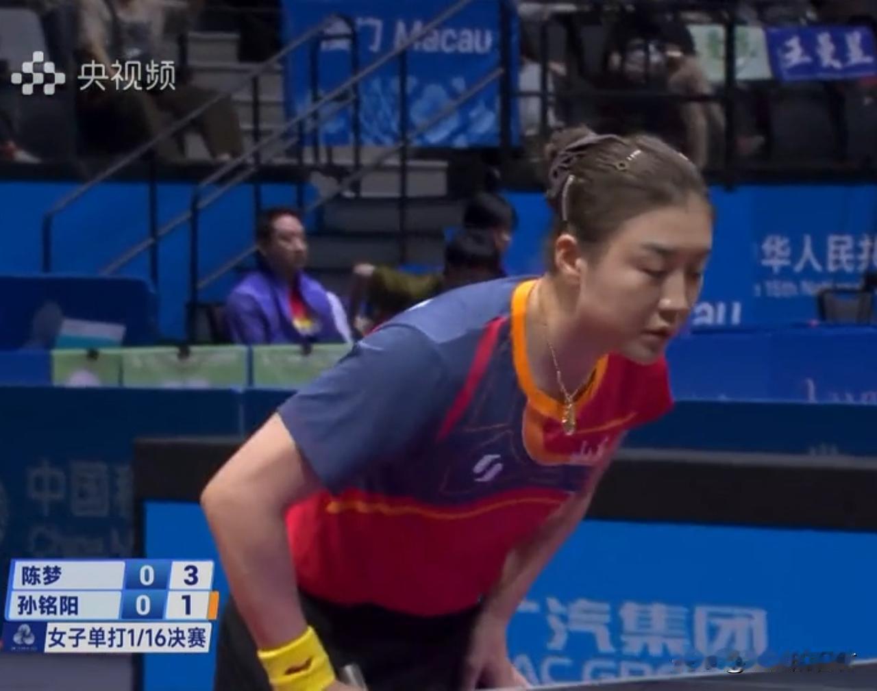 陈梦零封孙铭阳,晋级16强。 全运会乒乓球女单1/16决赛 山东陈梦4:0战胜上海孙铭阳 第一局开局5:1,陈梦得分6:1,陈梦得分7:1,陈梦正手进攻直线得分8:1,孙铭阳得分8:2,陈梦得分9:2,孙铭阳正手进攻直线得分8:3,孙铭阳得分9:4,陈梦反手得分10:4,陈梦反手球出台10:5,陈梦反手斜线得分11:5,陈梦赢下第一局。 第二局,开局5:3,双方得分8:5,陈梦得分9:5,陈梦连续得分11:5。陈梦赢下第二局。 第三局开局3:0,双方得分5:1,陈梦得分6:1,陈梦反手得分7:1,陈梦正手斜线得分8:1,陈梦得分9:1,孙铭阳得分9:2,孙铭阳得分9:3,陈梦得分10:3,陈梦得分11:3。陈梦赢下第三局。 第四局,开局1:4,孙铭阳得分1:5,陈梦连续得分3:5,陈梦连续得分6:5,陈梦得分7:5,陈梦发球直接得分8:5,陈梦发球正手抢攻得分9:5,孙铭阳连续得分9:7,陈梦得分10:7,陈梦发球直接得分11:7。陈梦赢下第四局。 陈梦4:0孙铭阳,晋级16强。 陈梦真强。