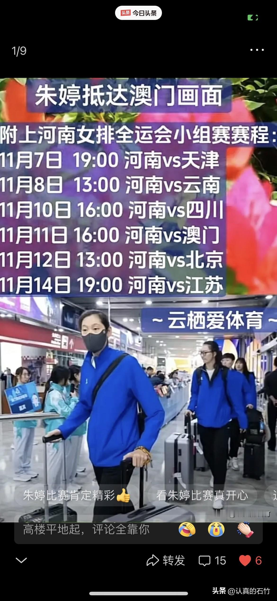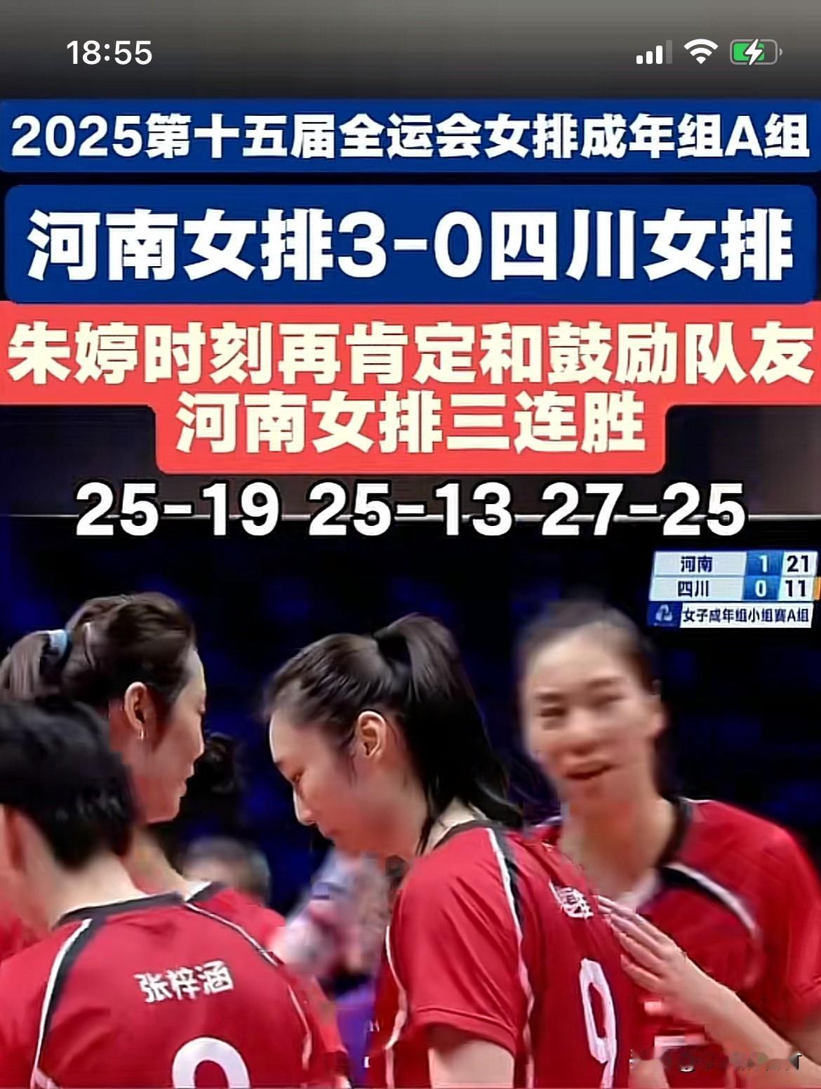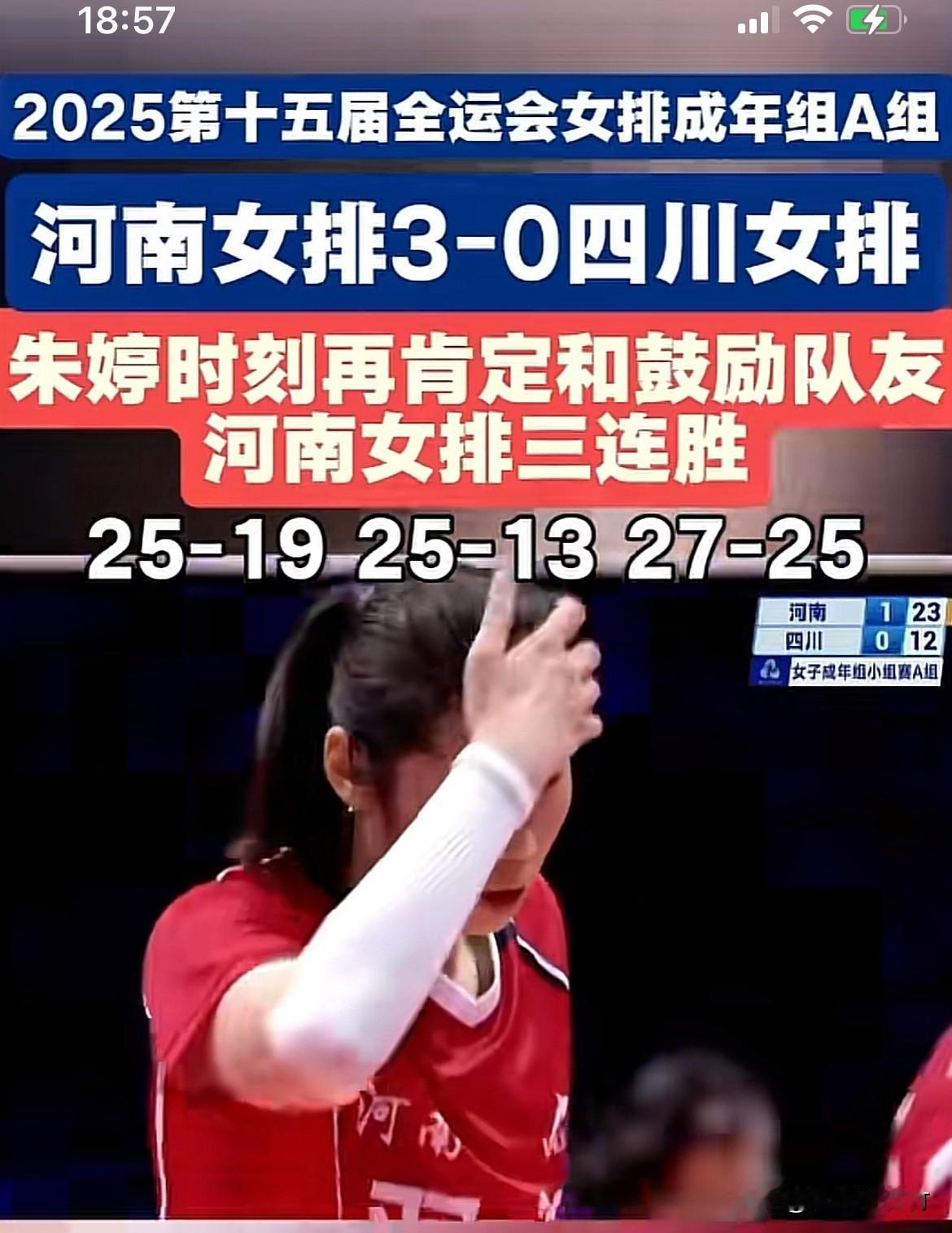 河南女排提前晋级八强!朱婷真棒👍 10号,河南女排3:0四川女排 朱婷太棒了。有一个大调攻,朱婷原地起跳扣球。舒展的扣球姿势真漂亮,全运会有朱婷参加对排球迷来说,多么幸福。朱婷拦网也非常好。 朱婷率领河南女排取得三连胜。 河南女排3:0天津女排 河南女排3:1云南女排 河南女排3:0四川女排 河南女排在朱婷的带领下提前晋级八强。 加油朱婷!加油河南女排。 真希望朱婷担任河南女排教练。把河南女排打造成强队。