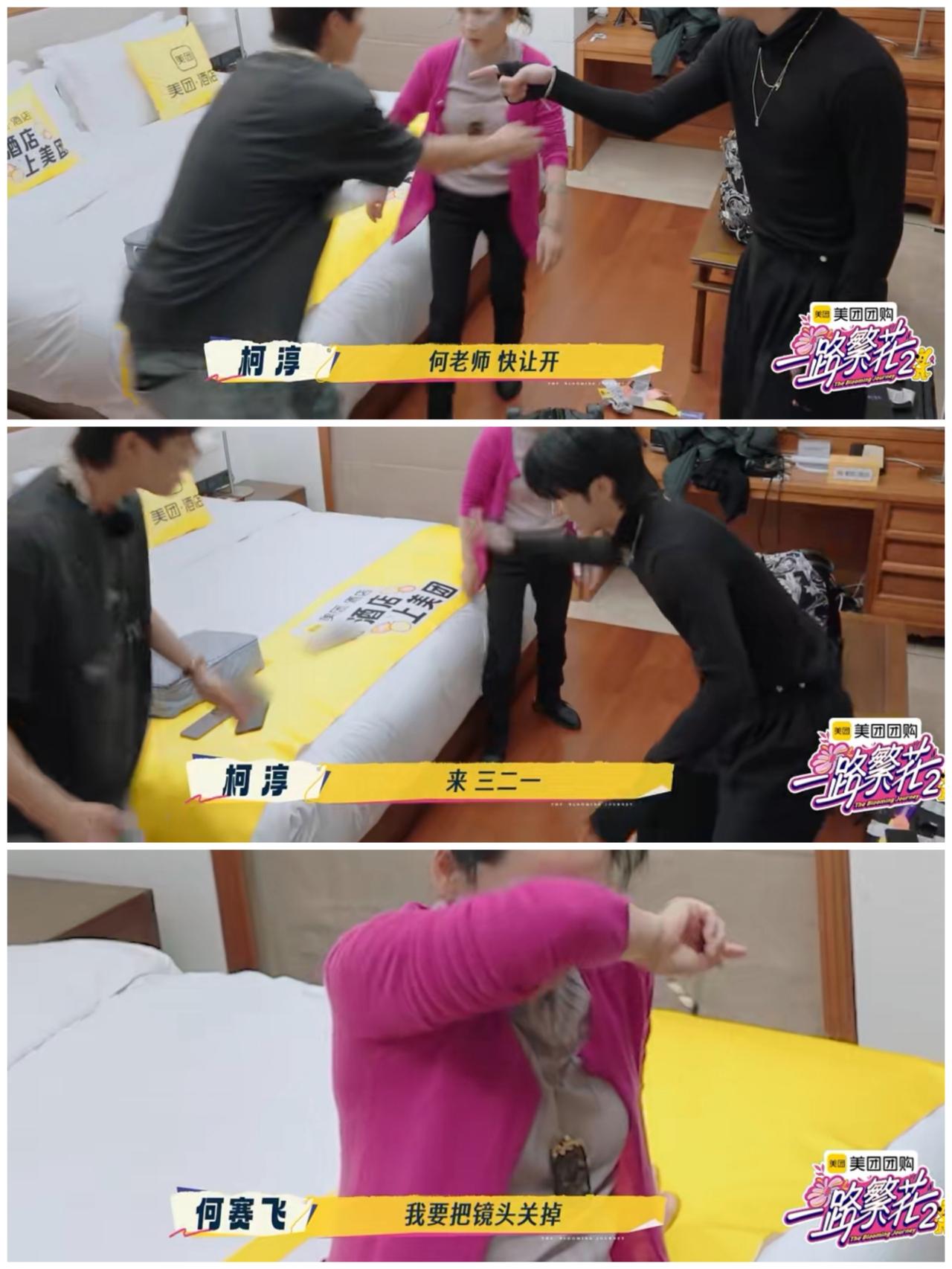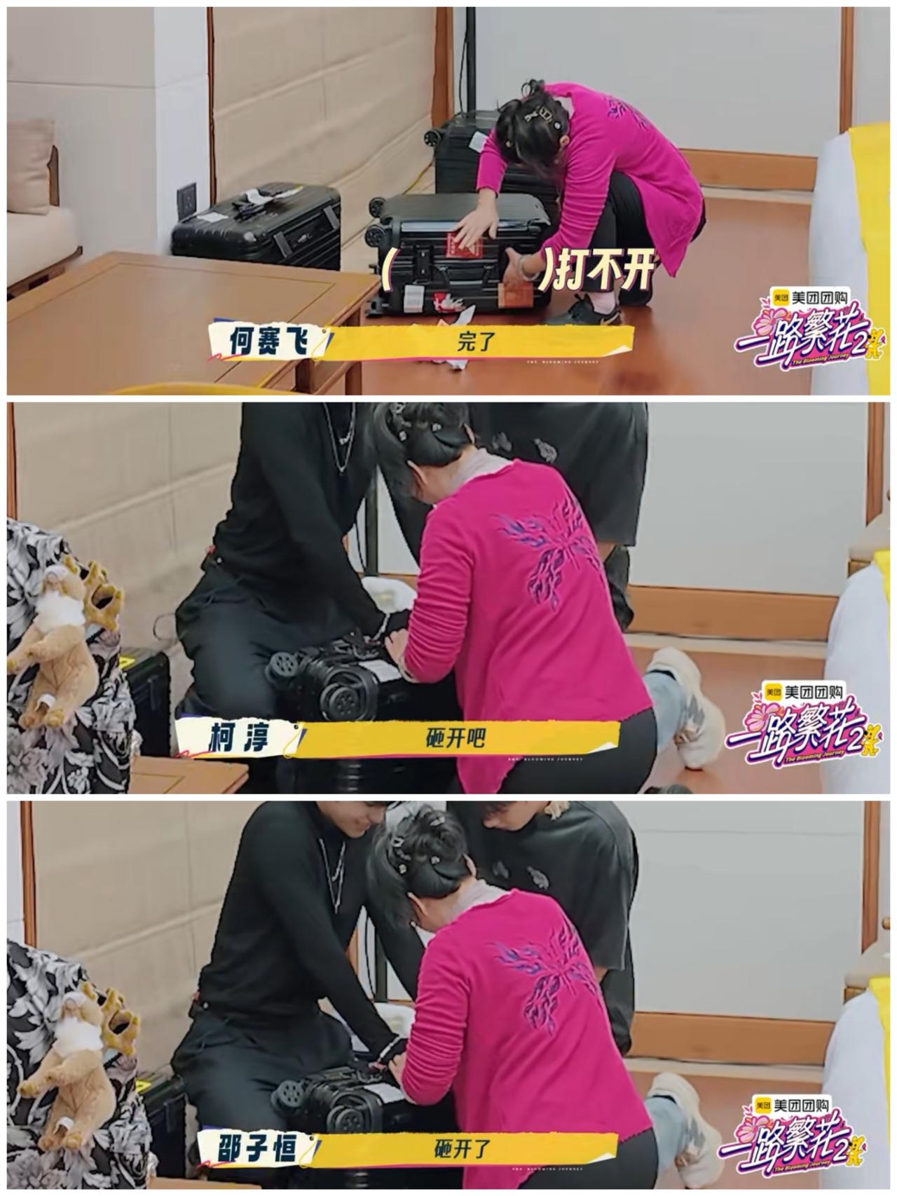 柯淳,邵子恒这个举动, 把何赛飞吓得抱头尖叫, 而张晚意,龚俊 是这样做的。 何赛飞的行李箱怎么都打不开, 她试了各种办法都不行, 于是他就求助于柯淳和邵子恒。 柯淳和邵子恒刚开始还 耐心查看行李箱情况, 但是多次尝试后, 还是无法打开。 接下来的画风就直接“疯走”。 只见邵子恒直接拿脚用力踩 行李箱的锁头, 试图暴力开锁, 行李箱被砸得都凹陷下去了。 他们砸得很开心, 觉得就是一个好玩的游戏。 而吓得何赛飞抱头尖叫。 看来她被邵子恒的行为吓得不轻呀。 而面对同样的行李箱打不开, 龚俊,张晚意也是尝试各种方法, 耐心也耗尽了, 但是他们没有直接暴力开锁。 而是张晚意打手电筒照着, 龚俊拿着专业开锁工具来开锁, 最后把锁打开了。 也许你会说, 也许柯淳,邵子恒当时找不到开锁工具, 不得不采取暴力开锁呀。 哎呀, 柯淳和邵子恒也没有 想到他们的暴力行为 会吓到何赛飞吧。 何赛飞甚至要求把镜头关掉, 她可能真的有点崩溃, 想要哭一下, 以此来发泄情绪吧。 平时看何赛飞那么霸气硬怼刘嘉玲, 想来也不是那么容易被吓到的人呀, 不知道是否是节目效果。 无论怎么说, 柯淳和邵子恒的暴力行为 都是考虑欠妥。 对着镜头这样做, 会对他们本身形象有不良影响呀。