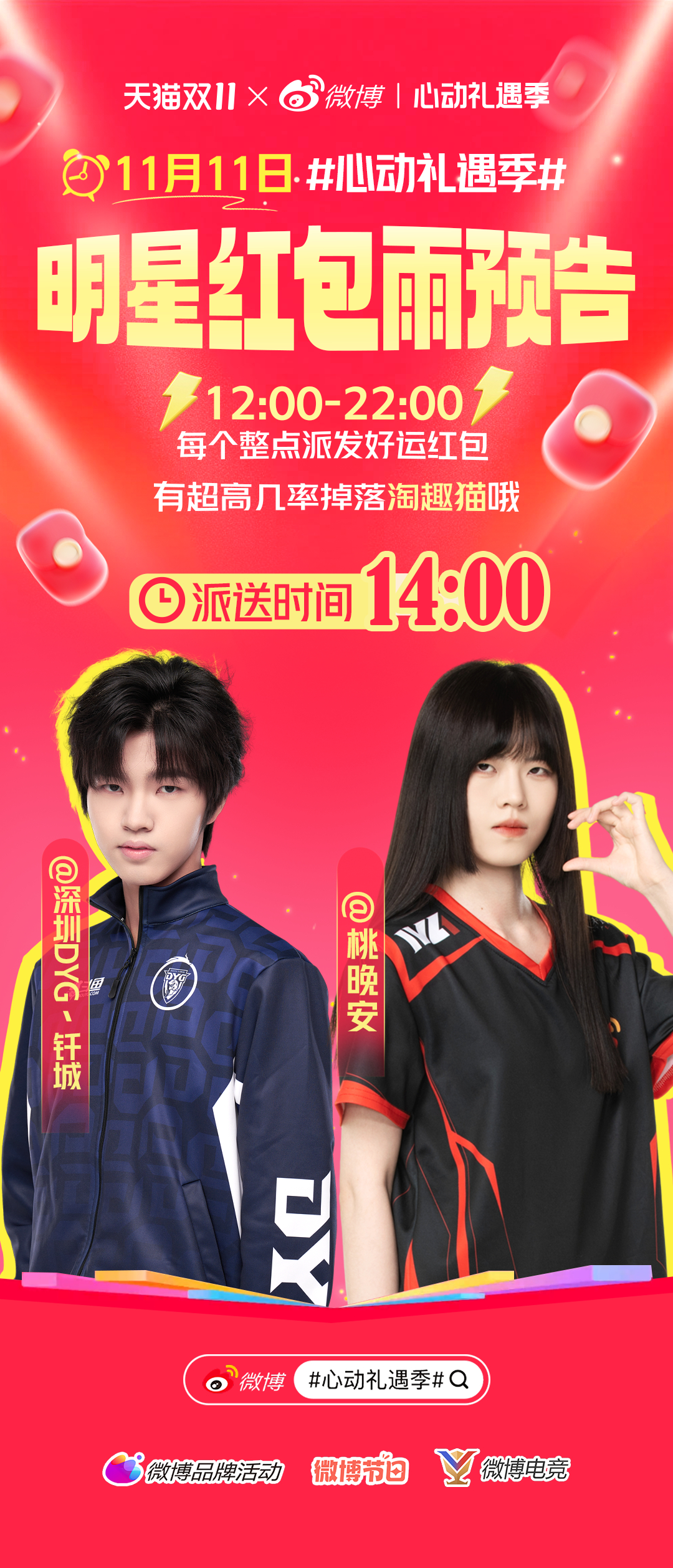 电竞人的双11福利暴击!最后72小时,选手整点发天猫好运红包,开包就有机会抽淘趣猫~ 全场券后7.7折起,红包+满减双重buff,省钱效率拉满,闭眼冲都不亏!