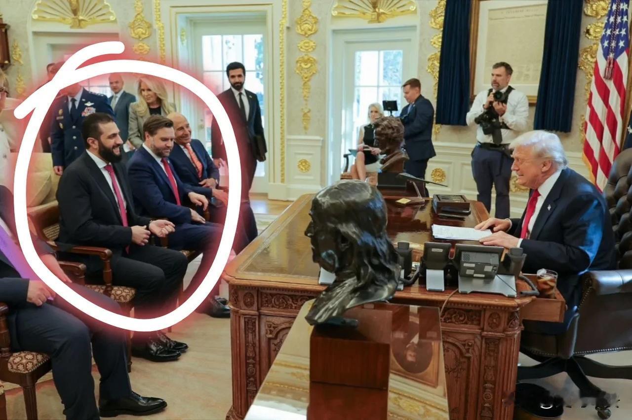 这是白宫的待客之道? 今天,美国总统特朗普在白宫椭圆形办公室与叙利亚代理总统沙雷会晤,但是白宫的代待客之道引发批评。在会晤时,特朗普坐在办公桌后的皮椅上,而叙利亚总统沙雷却与美国副总统万斯还有一些下属正坐在特朗普的桌前,这根本不是对等级别的两国会晤,看上去就像是上级在向下级开会一般,难道这就是美丽囯的待客之道和外交礼仪?