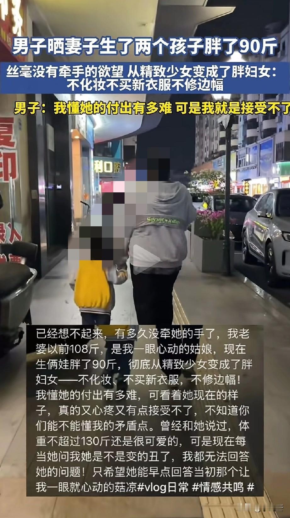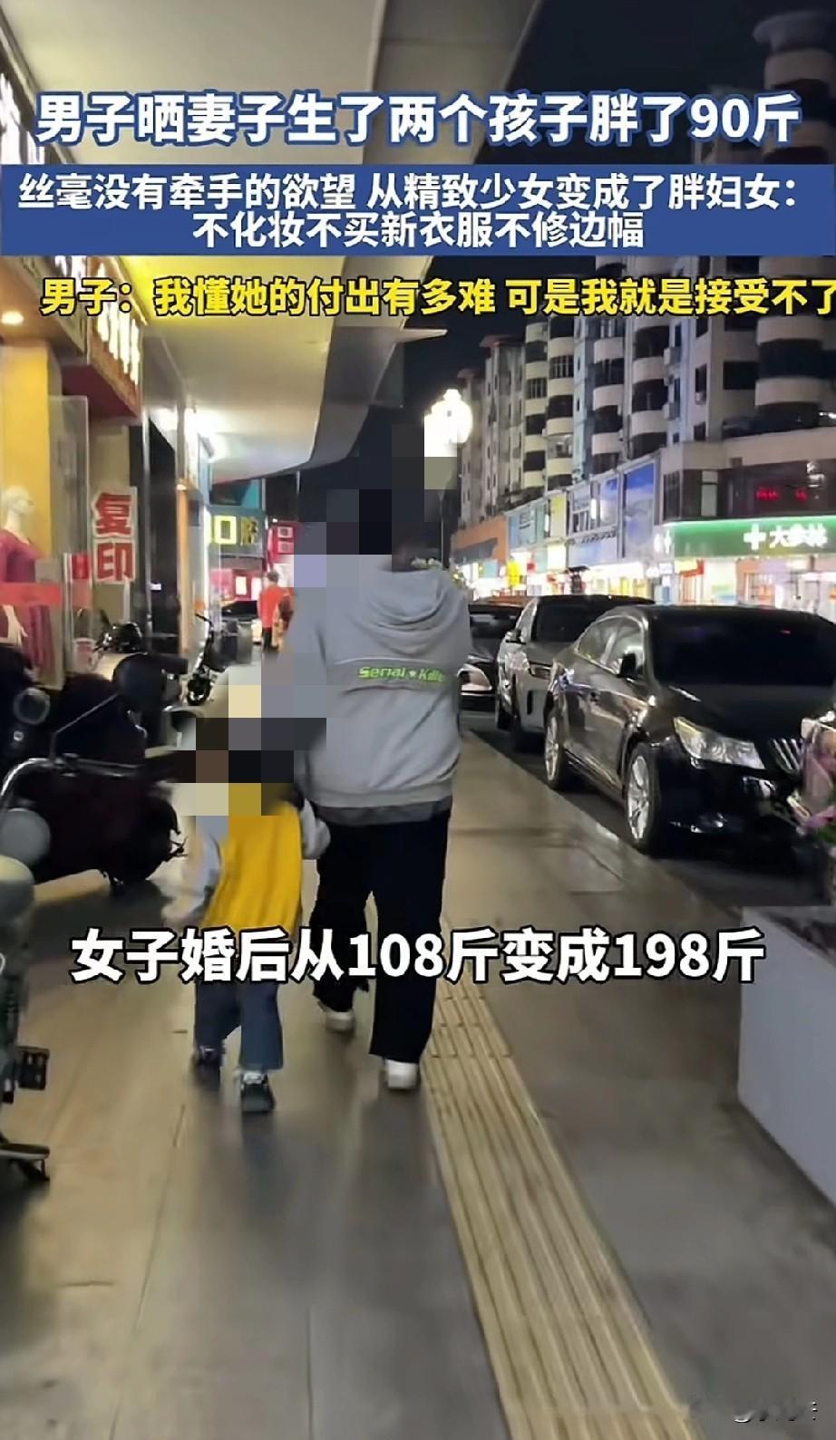 一男子晒出妻子领女儿逛街的视频,老婆牵着女儿手高兴的走在前。但是丈夫却远远躲在后,一点不愿意上前。男子说妻子结婚后从108胖到198,生了两个孩子,彻底从少女变成了胖妇女,虽然我懂她为家庭的付出,但是如今的模样,一点牵手的欲望都没有! 男子说老婆生了两个孩子,很勤俭持家,不化妆、不打扮、不买新衣服,每天照顾两个孩子,根本不修边幅! 男子:已经记不清有多久没牵过手了!之前和妻子委婉说过,不超过130还是觉得很可爱。 但如今看着妻子198的体重,当妻子问他好不好看,丑不丑的时候,自己都无法回答。 最后他还说希望老婆能回到当初一见钟情的模样。 心酸的是虽然女子很胖,衣着不修边幅,也没化妆。但是把女儿打扮的很干净卫生,给女儿扎着美美的小辫子,衣服也穿的干净漂亮。 女子领着女儿高兴的逛街,完全没有意识到丈夫对自己的嫌弃。 有人说,看到男人说的话,真挺女人心疼,如今的模样全是岁月操劳的痕迹,是因为女子的付出,才换了一家人的幸福生活,但却遭到身边人的嫌弃,实在不该。 还有人说接受不了就应该改变,多挣钱给女人报健身房,买新衣服办美容卡,自己多带孩子,让媳妇少操劳,她就有时间美了,而不是一边享受她的服务一边嫌弃她的外在!