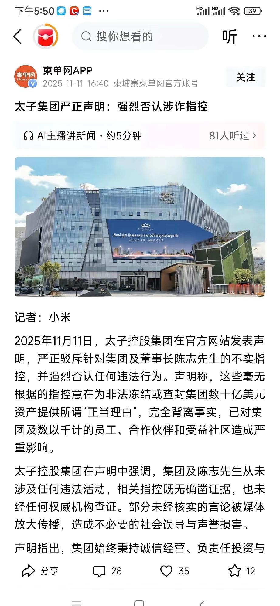 太子集团今天发声明了,在头条上发的,太子集团说没有诈骗,就是为了冻结巨额资产乱说的。 查封太子集团资产的,不仅仅有美、英、韩,而且还有新加坡、香港、台湾~~ 现在发声明,否认有任何违法行为,老板陈志在哪里? 太子集团 东南亚太子 太子那些事 太子中心